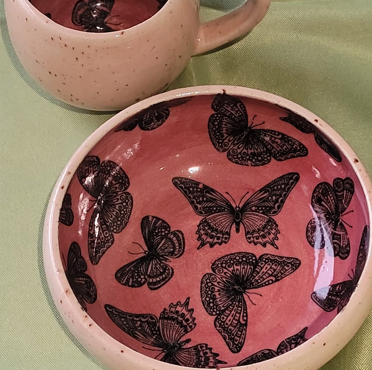 Pink patterned butterflies breakfast set bowl and mug handmade pottery