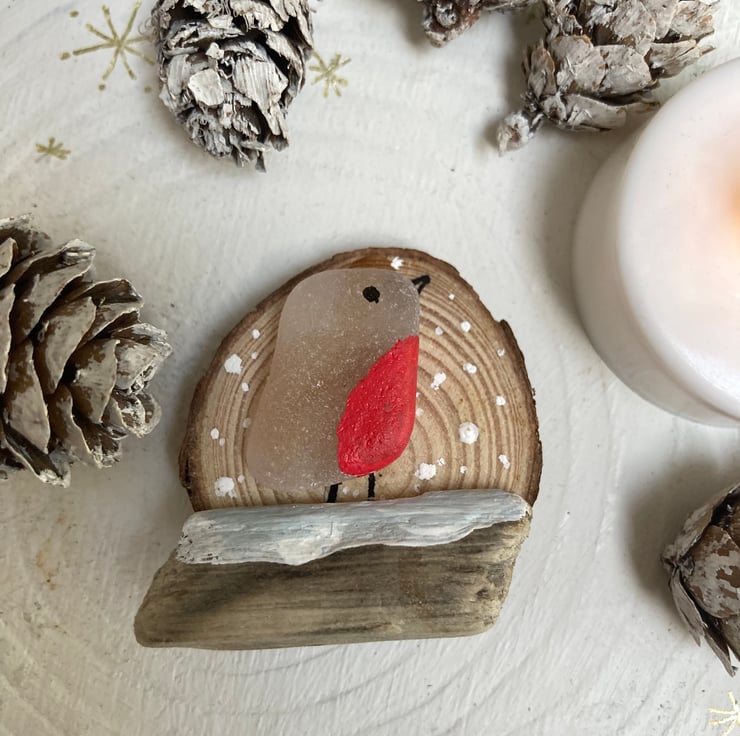 I have created this cute little robin using a piece of sea glass, mounted on a small wood slice and perched on a driftwood branch. I painted the breast red and painted on little legs and a beak.