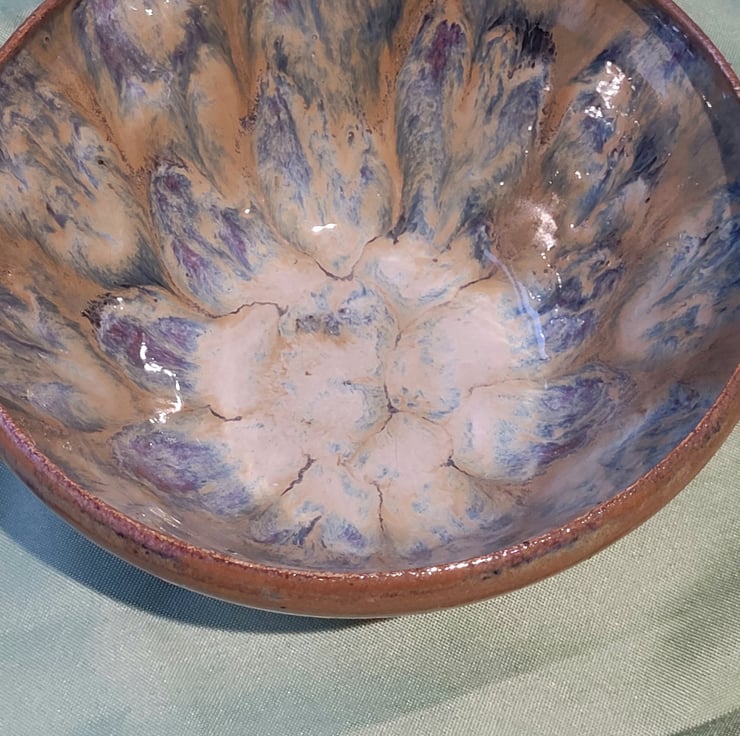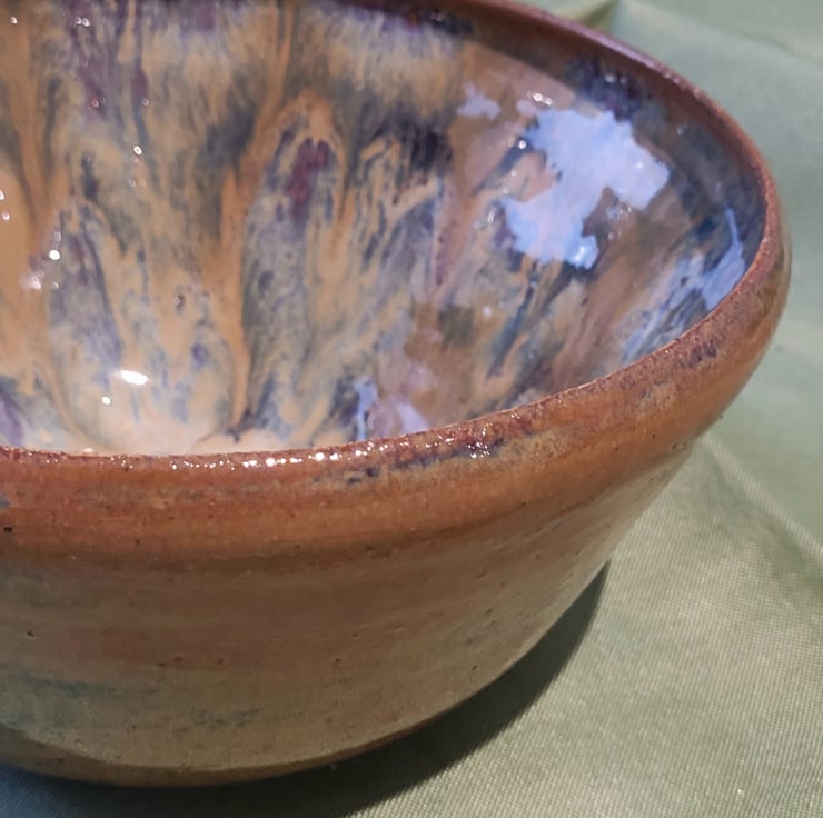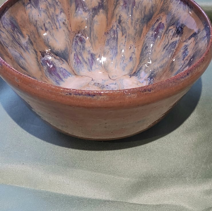 This wheel thrown bowl has a green-brown glaze with a pink tone on its outer surface. It's inner surface has a patterned green-brown, blue, pink glaze covering. This piece has a diameter of 19cm and a height of 9cm.
