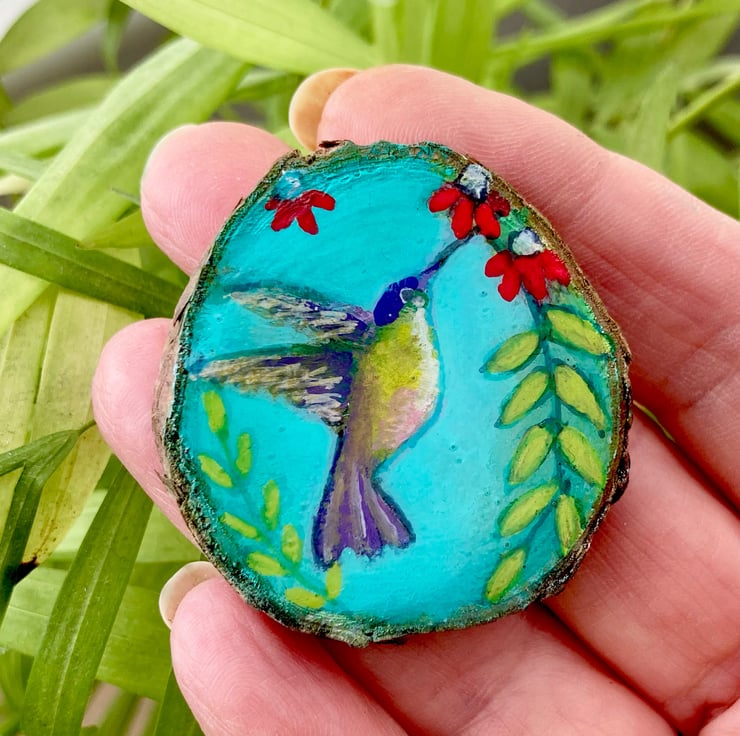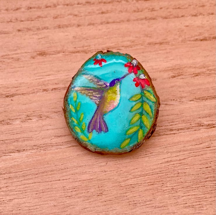 Beautiful Hummingbird miniature painting on a wood slice brooch/pin