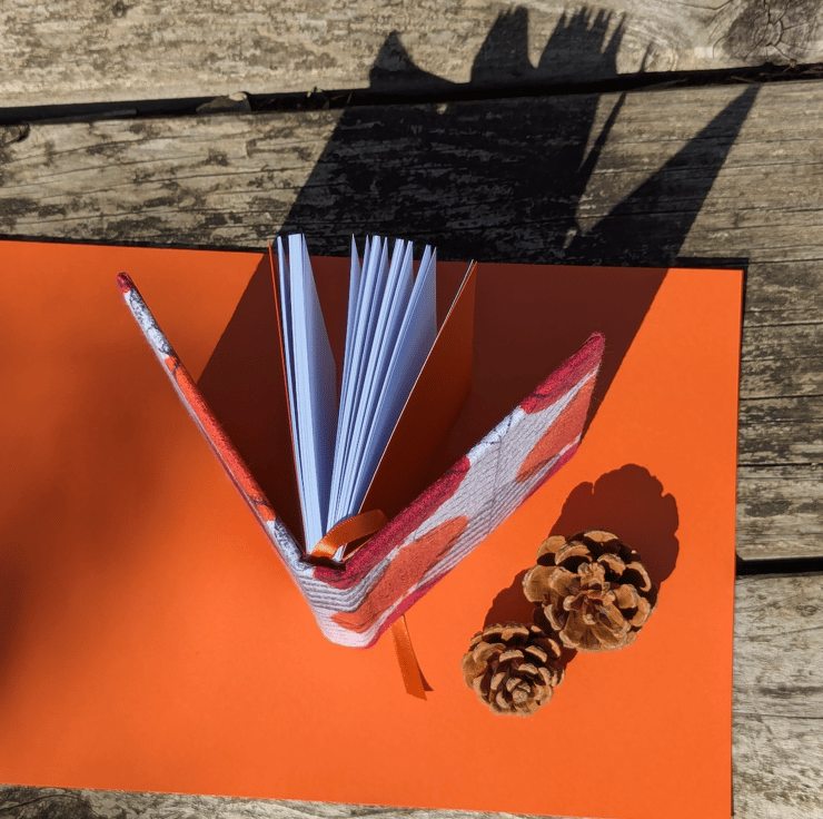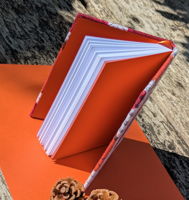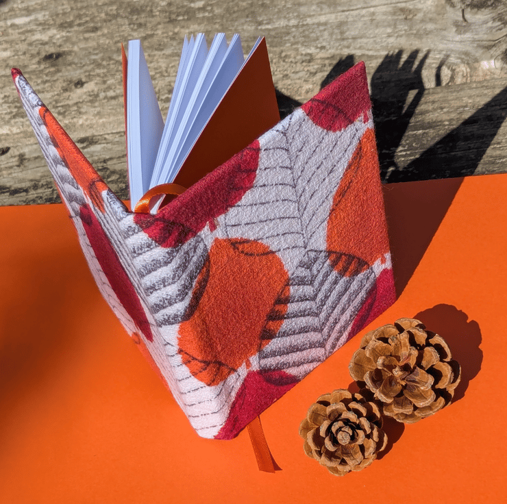 Each book I make includes a ribbon bookmark and coloured end-papers made from high quality Canford or Canson paper, hand picked to match one of the colours in the fabric design. This book has an autumnal orange satin ribbon and matching Canford end papers.