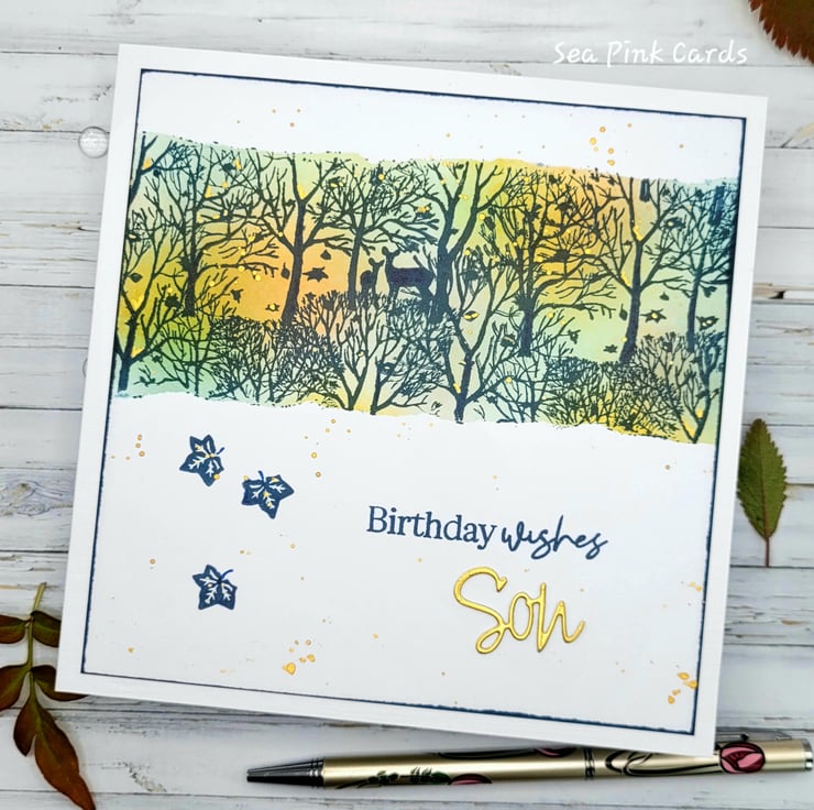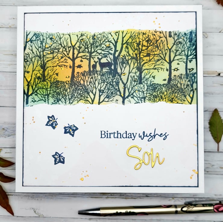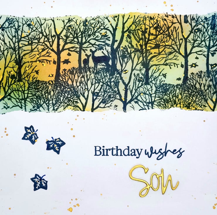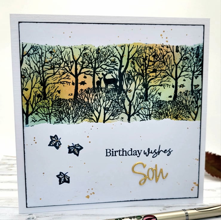 I have used archival inks in natural warm colours and then overstamped the colourful background with a stamp featuring trees, leaves and deer. There is a birthday sentiment on the front and a die-cut 'Son' in matt gold card. The inside has a white insert with ... have a wonderful day! I have also added details with a gold fineliner pen.