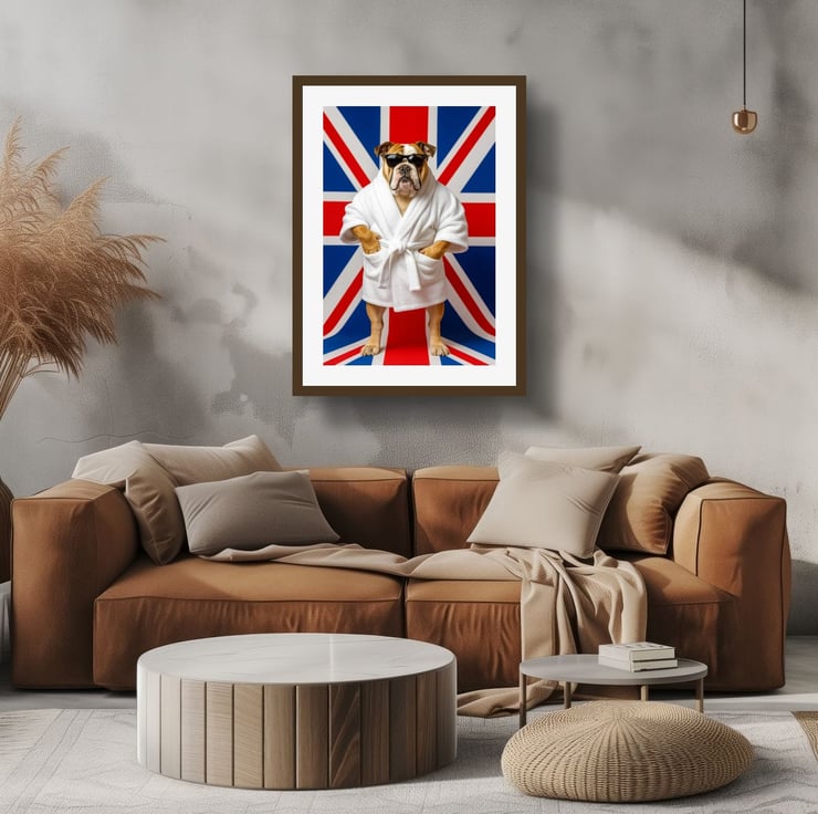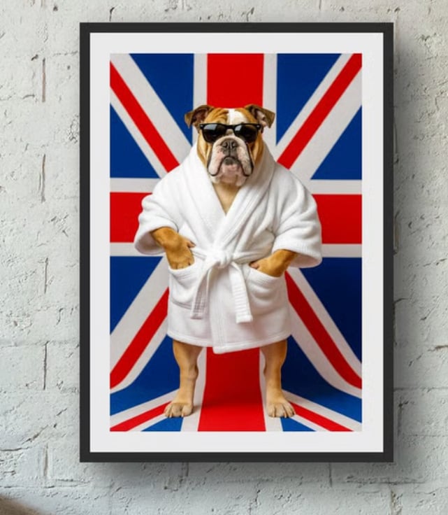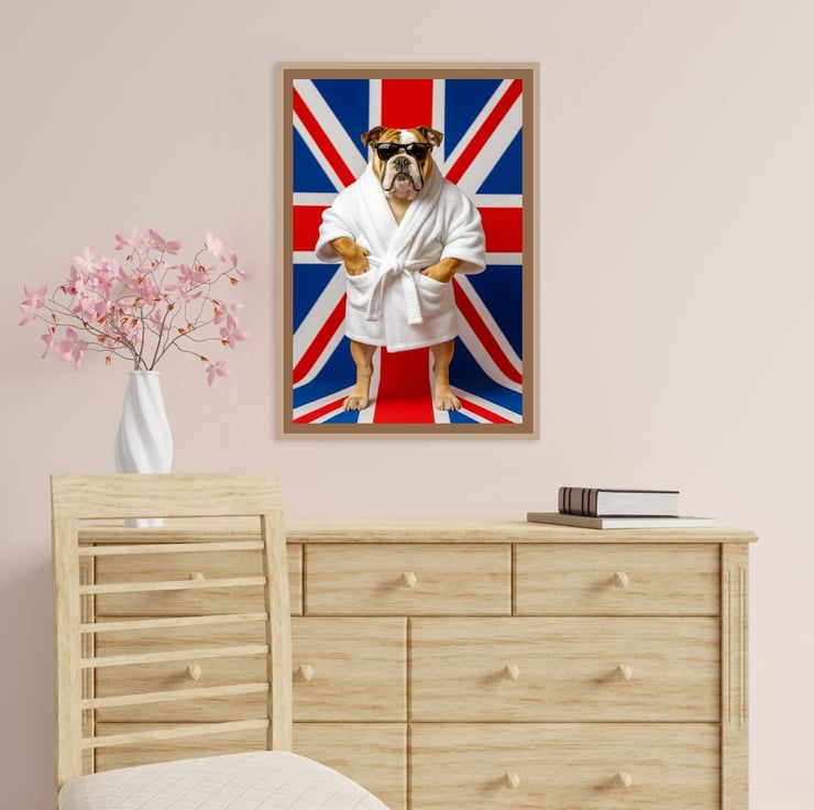 This bold and playful artwork features a British bulldog standing proud in a spa robe and sunglasses against a Union Jack backdrop. It is a fun and striking print that brings both humour and personality into your space.