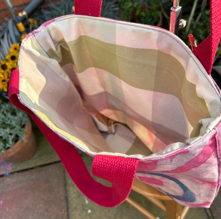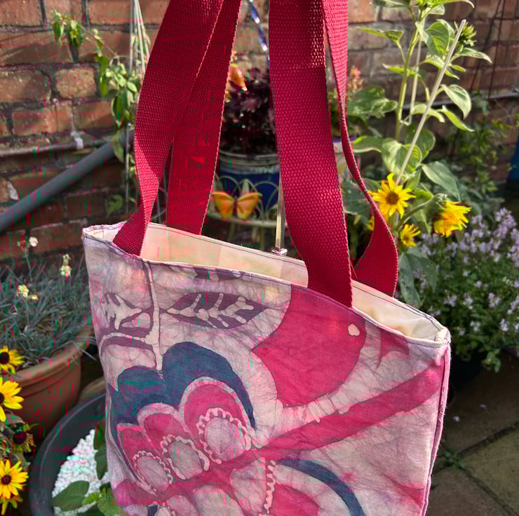 Outer original 1960's student work dyed cloth. lining second hand pristine cloth. Red canvas new handles.