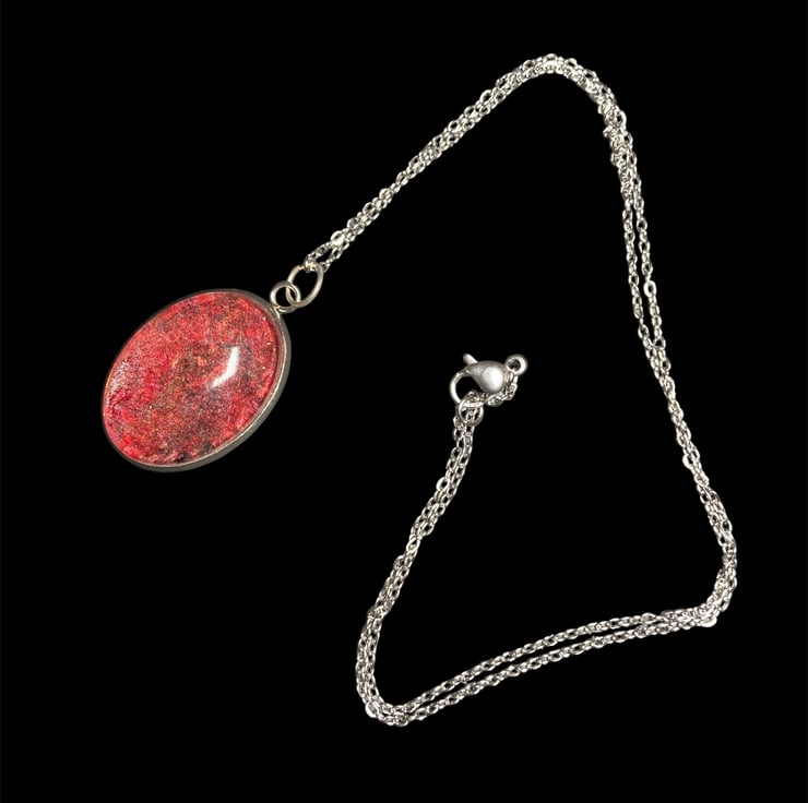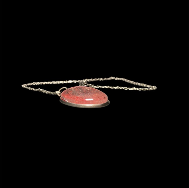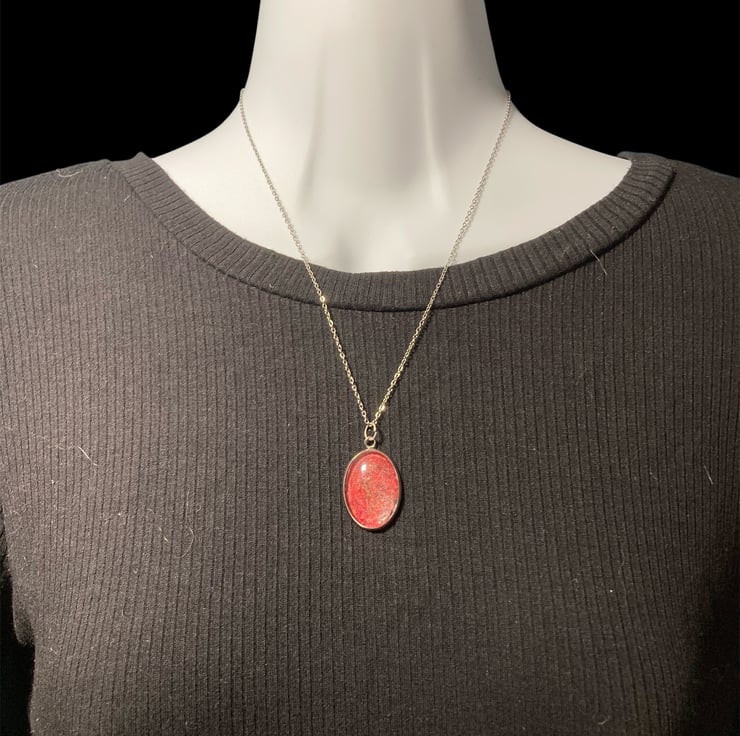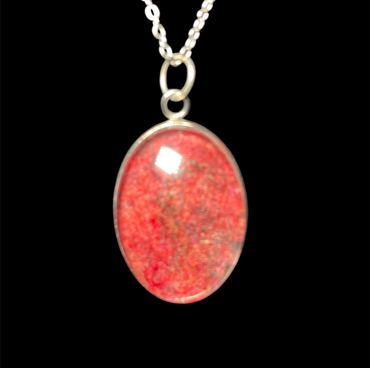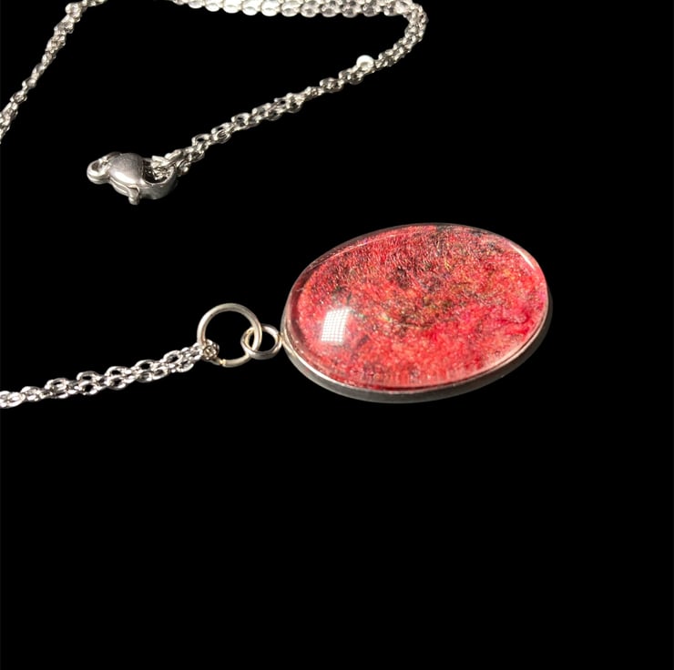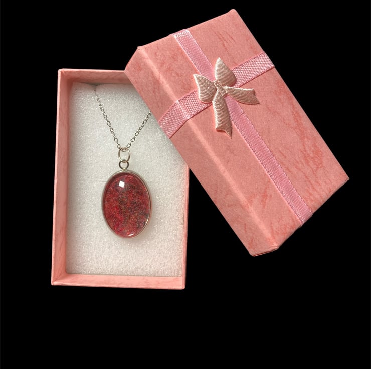 This striking red pendant has been made using a piece of handmade felt topped with multicoloured silk fibres. The felt has been encased in an oval silver coloured stainless steel pendant beneath a glass cabochon. The texture and colours of the felt/silk are beautifully displayed. The pendant measures approximately 25mm x 18mm and is supplied with an 18" silver coloured stainless steel chain with a lobster clasp. A pretty pink gift box is available as an option but will result in increased postage costs.