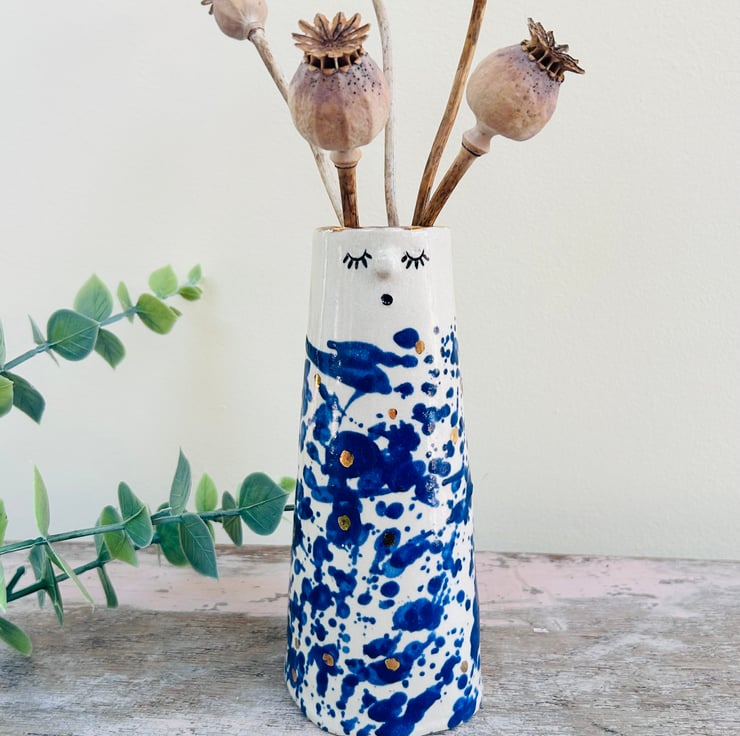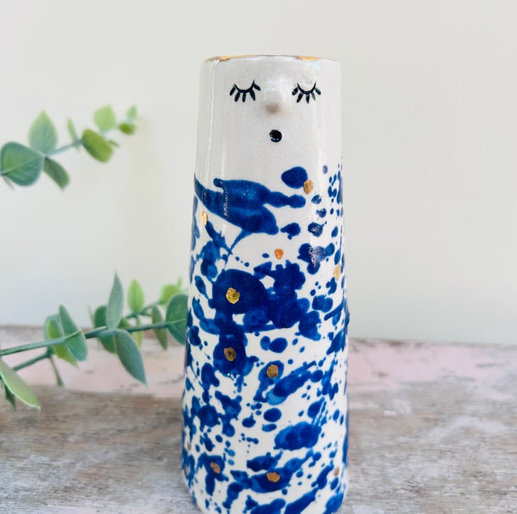 A delightful lady finished with a blue splatter pattern with flecks of gold.