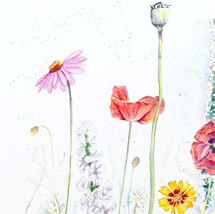 This watercolor print depicts a lively meadow of wildflowers, rendered with delicate washes and fine linework. The composition features an airy arrangement of poppies, daisies, cosmos, and other blooms, their slender stems rising gracefully against a white background. Subtle splashes of color and soft gradients create a sense of movement and lightness, while the varied palette—reds, yellows, purples, and greens—captures the spontaneity and vbrancy of nature. The overall effect is fresh, whimsical, and gently expressive.
