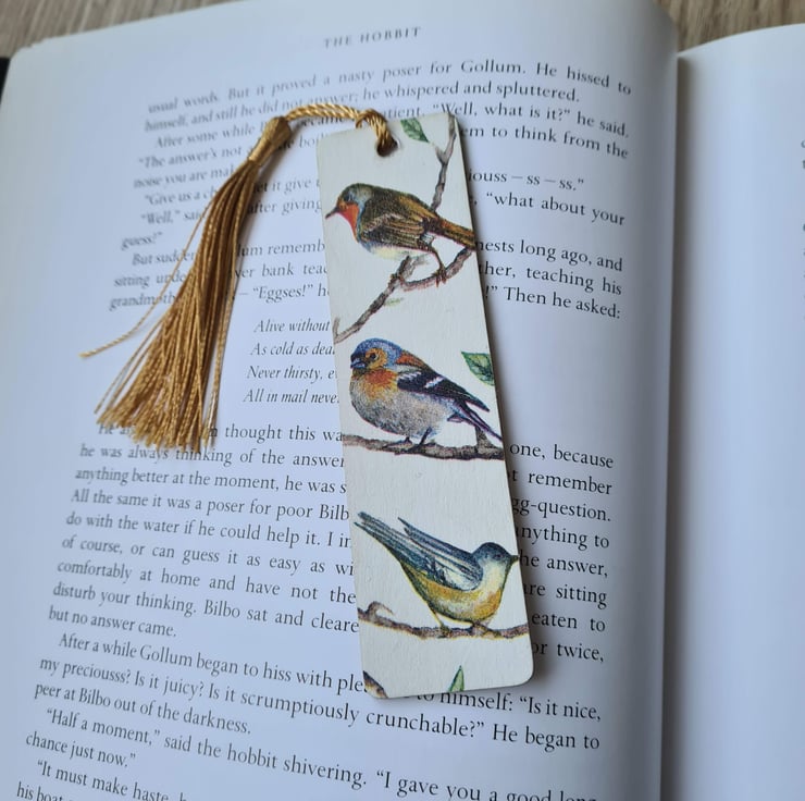 This cute wooden bookmark has been decoupaged using a pretty bird design paper napkin, then varnished to protect it and finished with a matching tassel.
