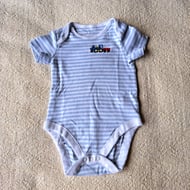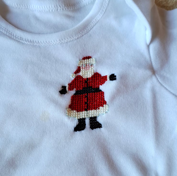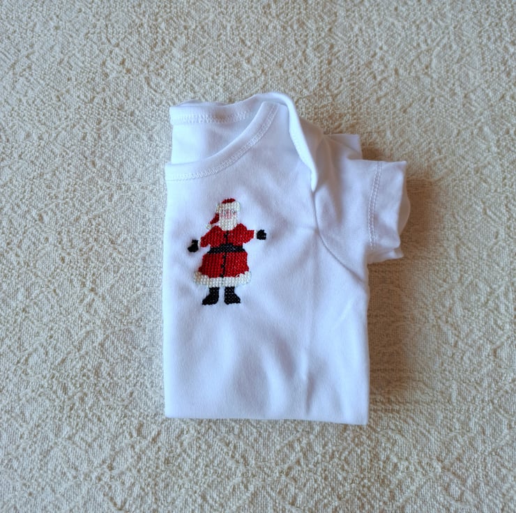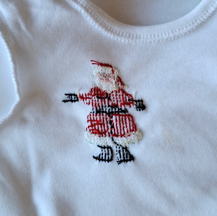 I have hand stitched a blue-eyed Father Christmas on this soft white baby vest/onesie. He wears a red bobble-hat with a white fur trim, a fur-trimmed scarlet coat and black belt, gloves and boots. As I never use a permanent backing fabric when hand embroidering kids' clothing there is nothing inside to irritate your child's skin. The vest has an envelope neck, short sleeves and two press studs between the leg openings. It is all cotton and can be machine washed.