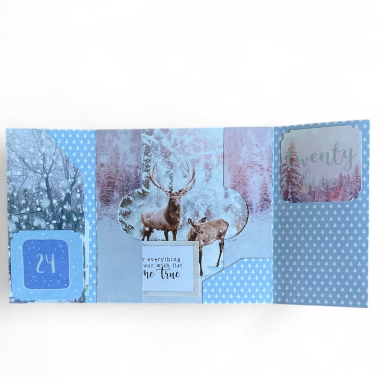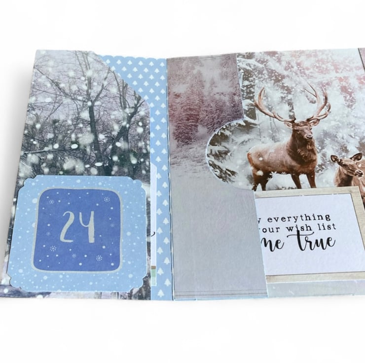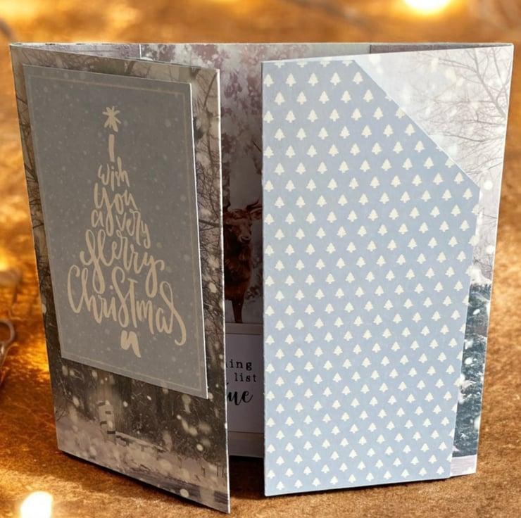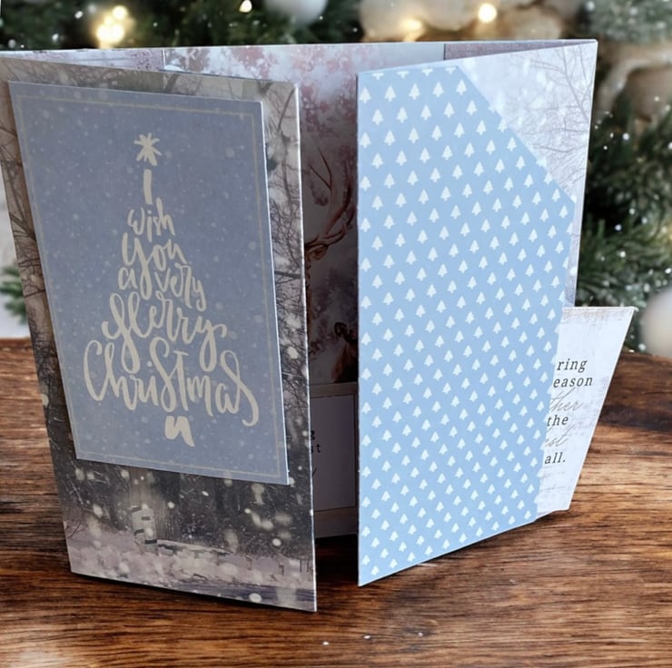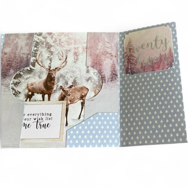 Celebrate the magic of the season with this handcrafted gatefold Christmas card featuring a snowy winter scene with reindeer. Designed in a journal style, the card opens to reveal a cozy layout with tuck slots perfectly sized for a gift card, money, or a personal note. A thoughtful way to share warm wishes and a little extra holiday surprise.