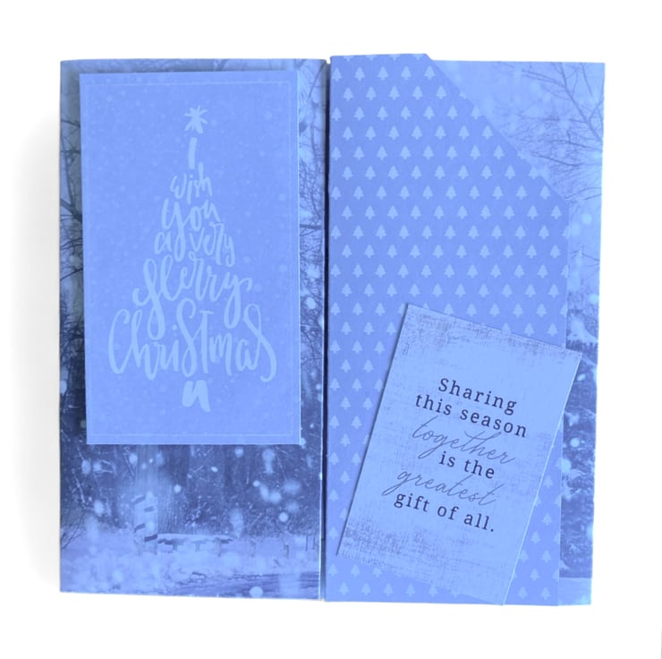 Perfect for family and friends, this card combines the charm of a winter wonderland scene with the practicality of a built-in gift holder