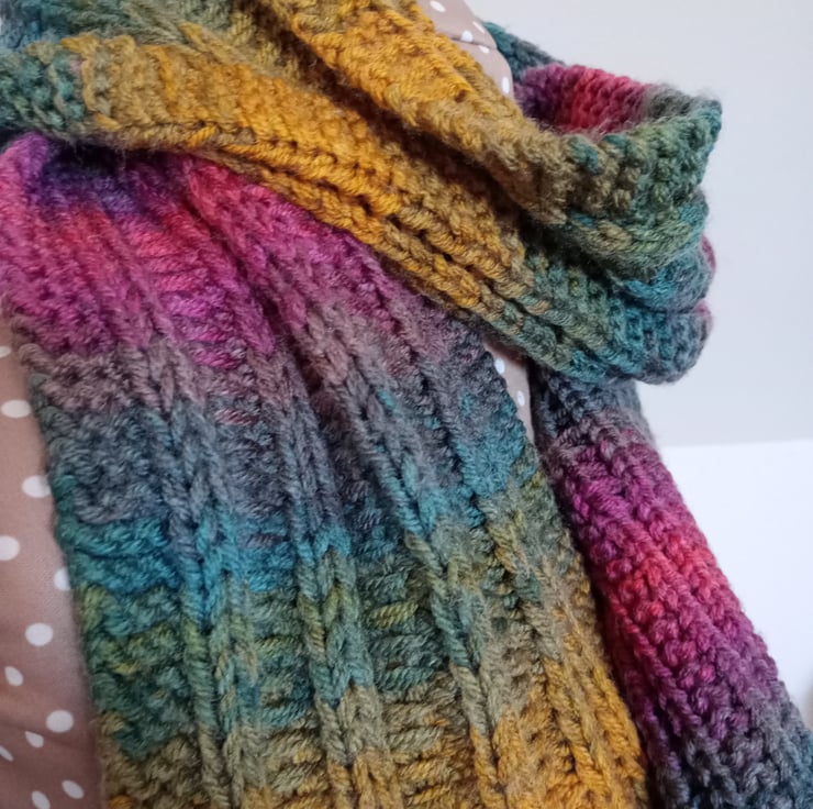 My synaesthesia is a big influence in everything I make. As someone who sees sound, music is deeply important and I love making physical representations of the songs I like to listen to. This scarf is inspired by the track Kings and Queens by Ava Maxx. I decided to work with texture rather than colour, so the patterning of the scarf is representative of the song rather than the colour.