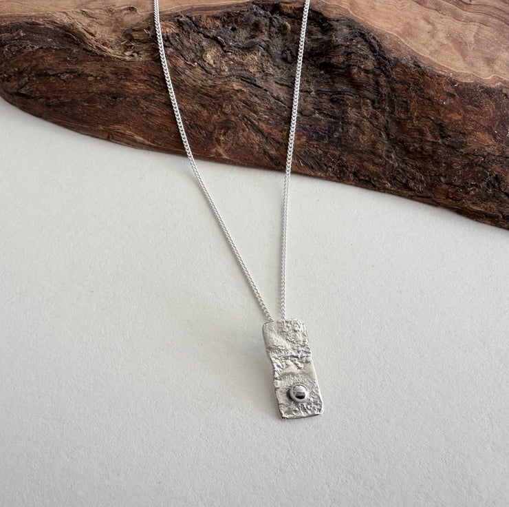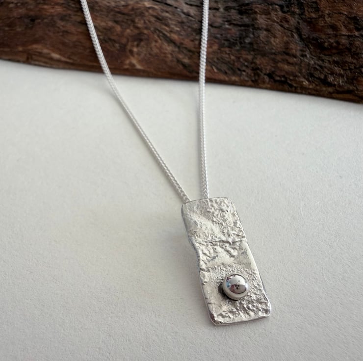 A one of a kind rectangular piece of reticulated silver with a molten droplet of polished silver create this stunning unique pendant.