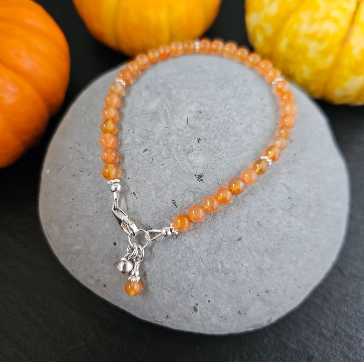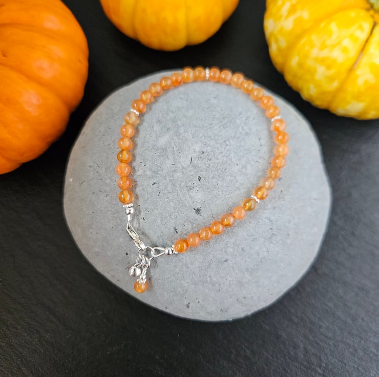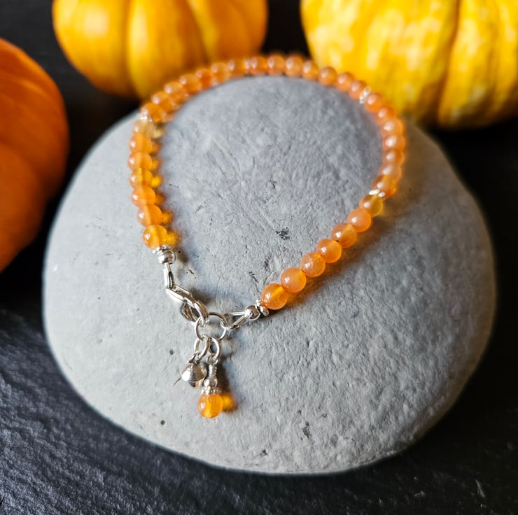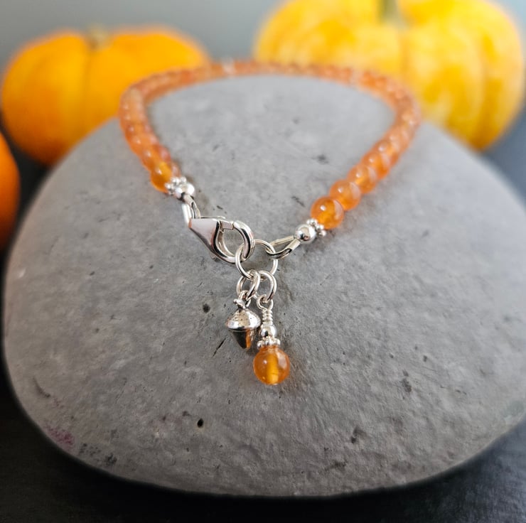 Inspired by the warming colours of Autumn, this pretty bracelet is made with 4.5mm round orange carnelian gemstones interspaced with sterling silver flower-shaped Bali spacers. It is embellished with a matching carnelian charm stone and a pretty silver acorn charm. The bracelet fastens with a sterling silver carabiner clasp and is threaded on strong and flexible 49-strand jewellery wire. All the metal components of the bracelet are sterling silver.
