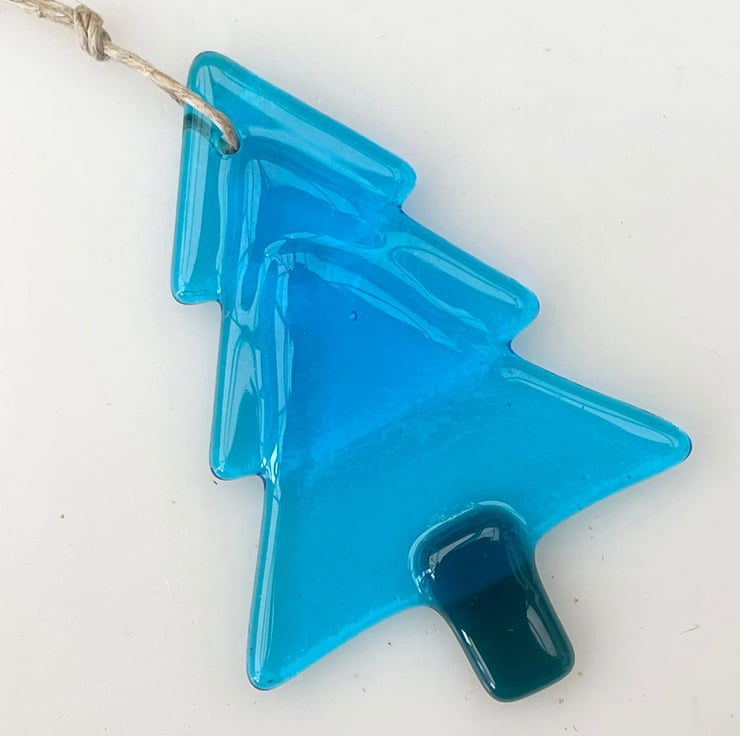 Pretty little Christmas Tree in light turquoise glass, threaded with natural twine.