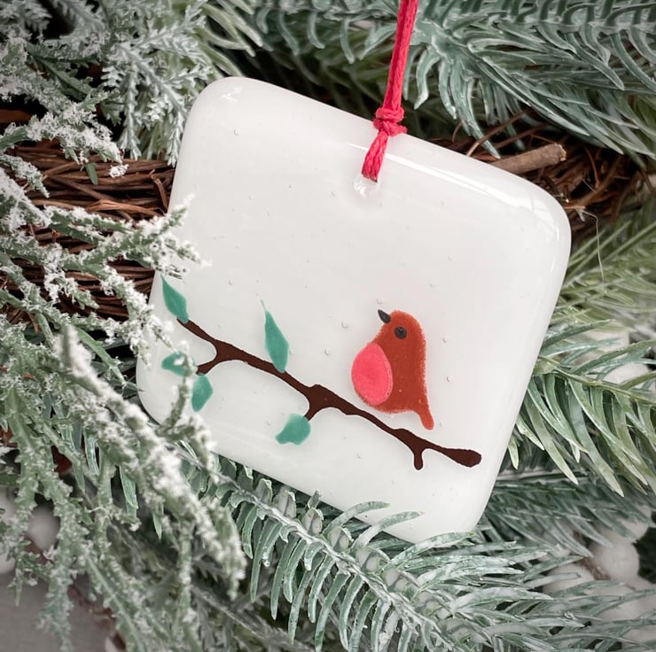 Soft white little square hangers with a hand painted robin perched on a snowy branch, a lovely addition to your Christmas tree.