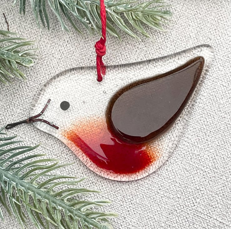 This handmade glass robin is beautifully smooth, the soft brown wing accent is fused to be slightly raised.