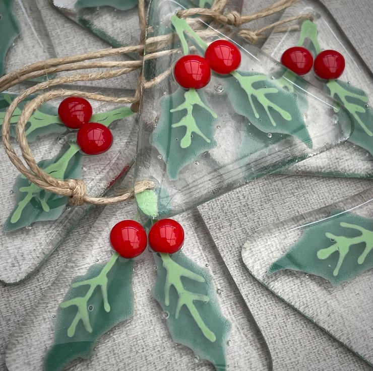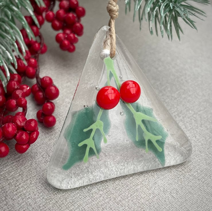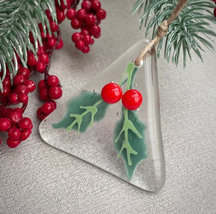 Holly Berry tree decoration, hand painted clear fused glass with two luscious red berries.