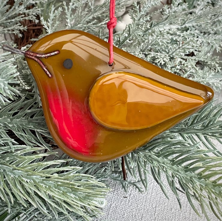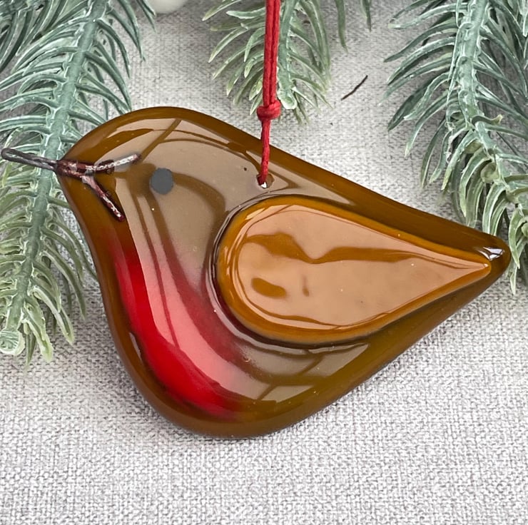 Wonderful handmade fused glass, pebble smooth and glossy. This robin is made using opaque caramel glass, with a lighter accent for its wing. It's threaded with dyed natural jute ready to hang on your Christmas tree.