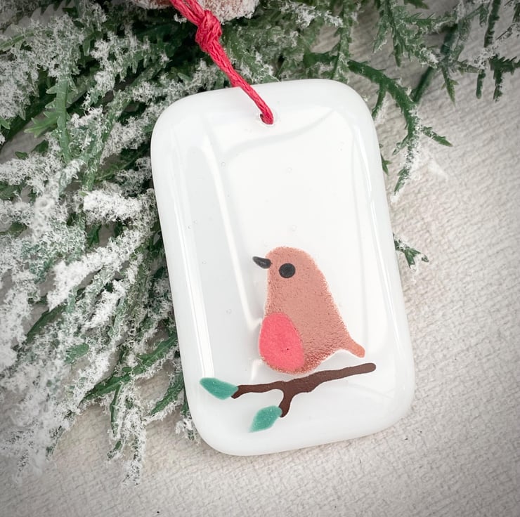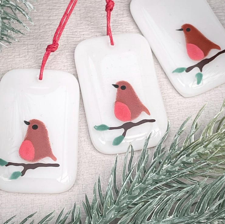 Cute little rectangular decorations with a hand painted robin sat on a branch, a lovely addition to your Christmas tree.