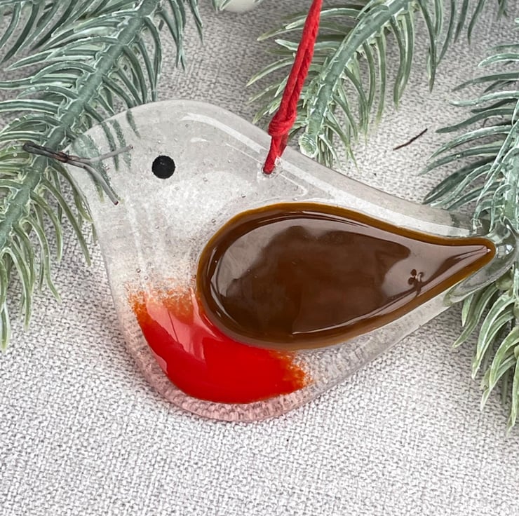 A gorgeous handmade fused glass Robin, pebble smooth to hold and threaded with natural dyed jute ready to hang on your Christmas tree or anywhere they will catch the light.