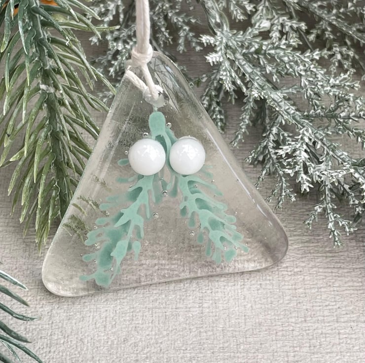 A gorgeous festive Christmas Tree decoration hand painted fused glass, each with a sprig of foliage and two glossy white berries. Snowberry decorations look fabulous on a white, green and silver themed tree :)