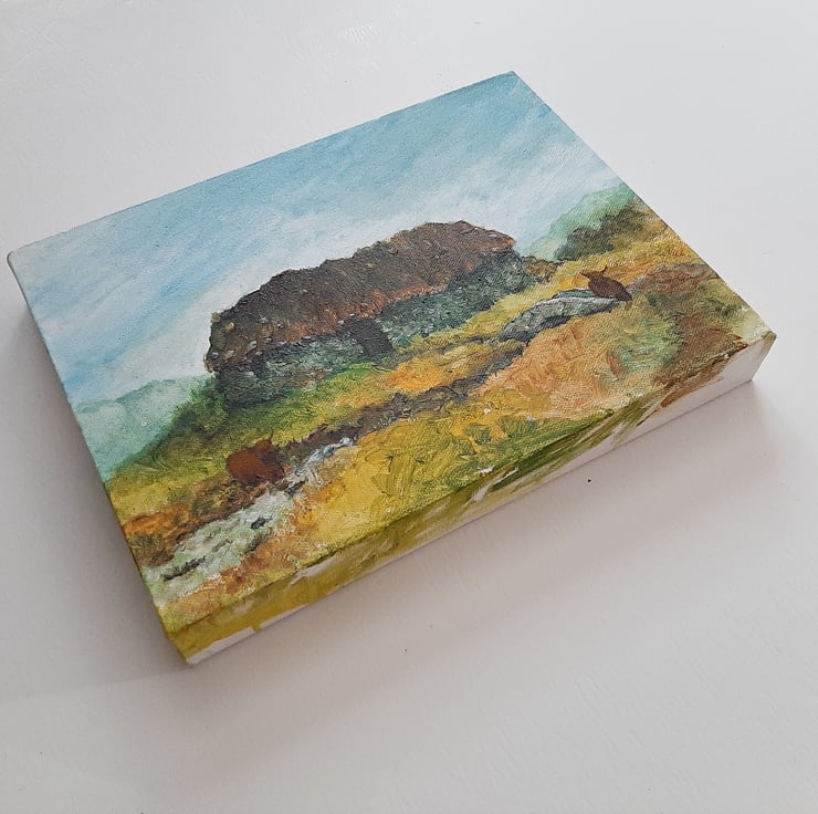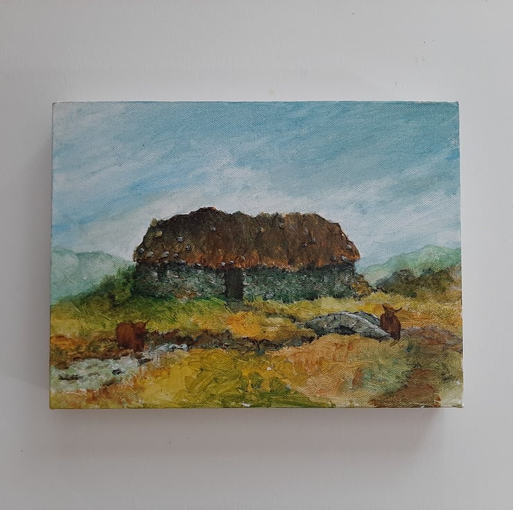 Original acrylic painting by myself of an auld, auld crofters dwelling , with highland cows grazing outside on a deep box canvas
