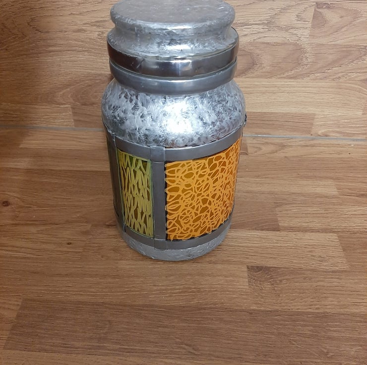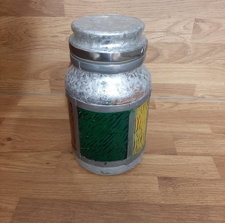 Jar has central band of stained glass effect coloured sections, framed with bright metal leading , similarly top is silver painted with metal leading