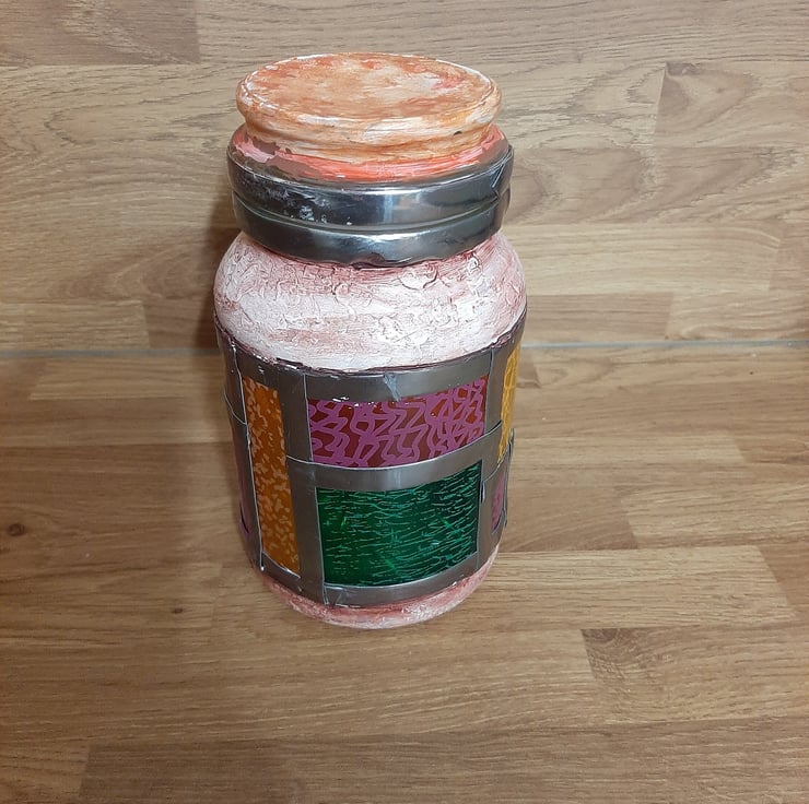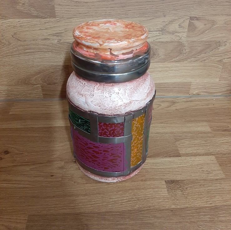 Jar is painted with central band of stained glass effect coloured sections, framed with bright metal leading , similarly top is painted body painted with metal leading