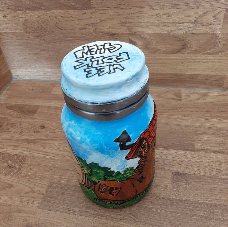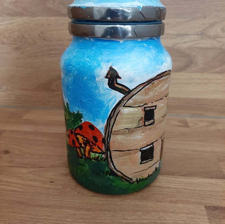 Scene on jar is my take on kid's story rhyme The Old woman who lived in a shoe ......just one of many things human giants have lost that the Wee Folk have made their own .