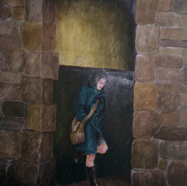 My original painting depicts me as a pre teenage laddie up a close sheltering from rain and wind .
