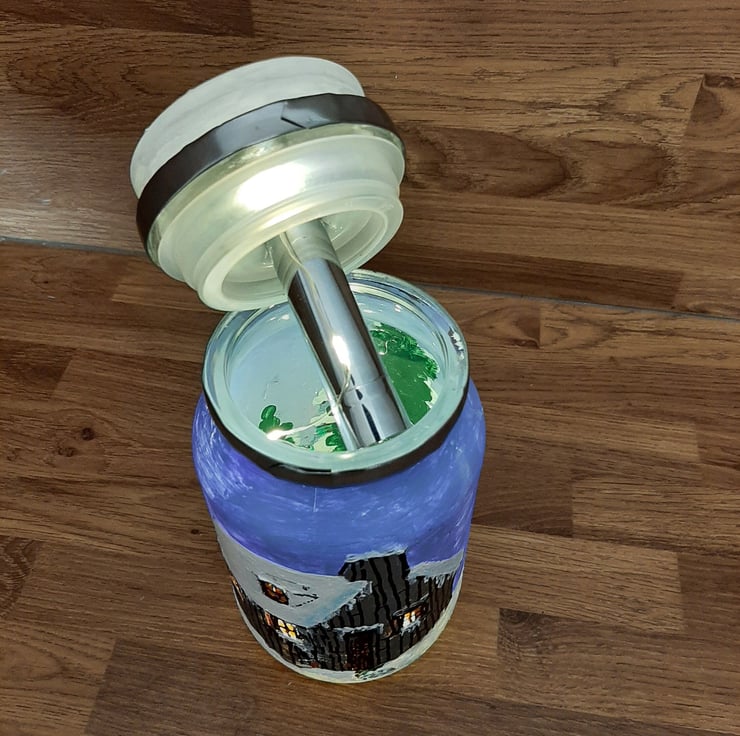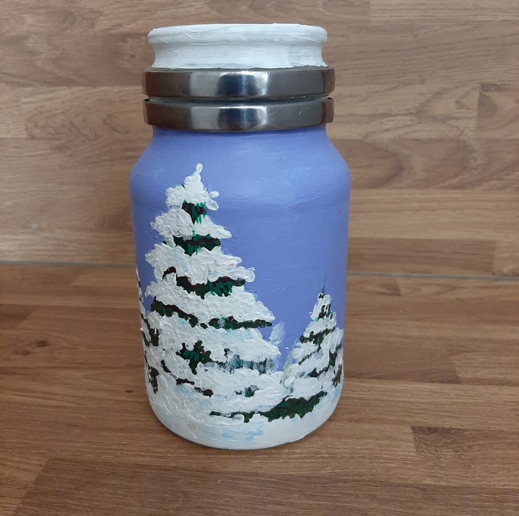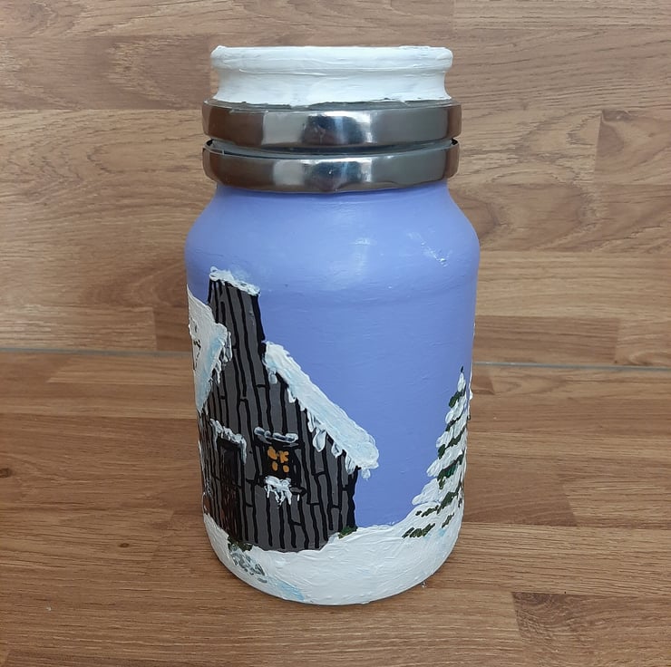 hand painted winter scene on a heavy glass jar. battery unit for 20 led lights fitted in jar lid