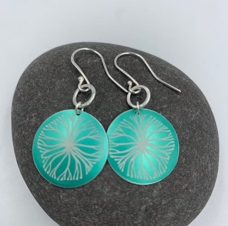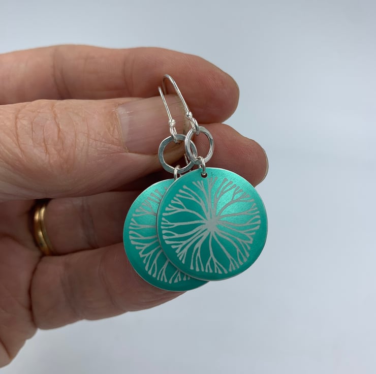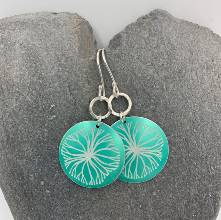 These teal handmade aluminium circle earrings have an intricate tree design. I hand drew the design before laster etching it onto vibrant teal dyed metal. The circle was then domed to give it a more 3D shape. I added a handmade hammered silver ring for the earrings to dangle from.