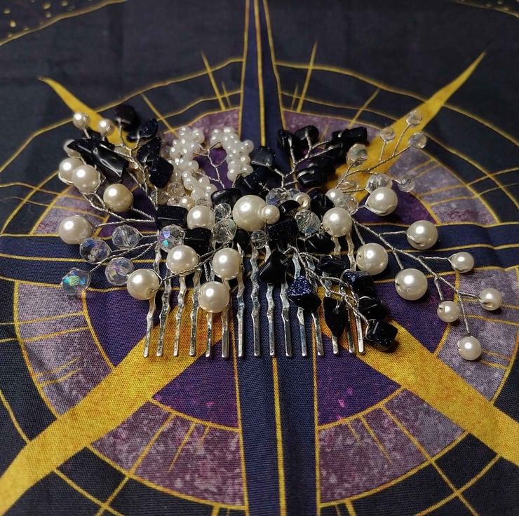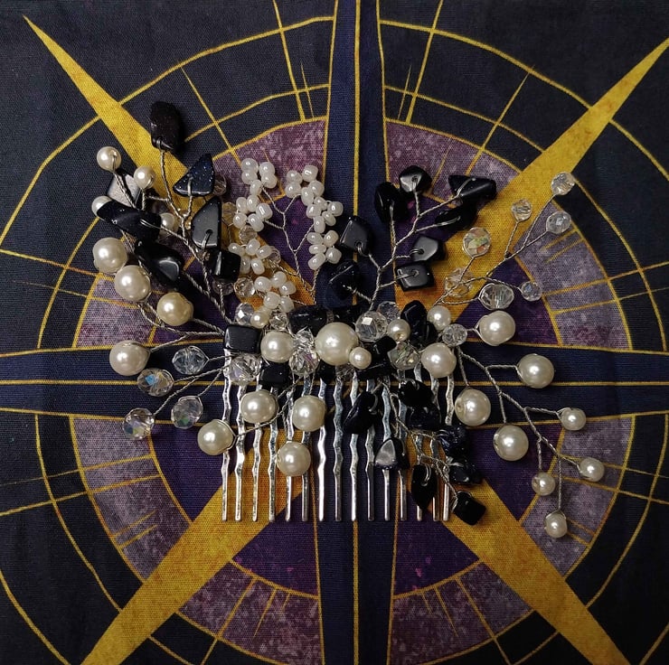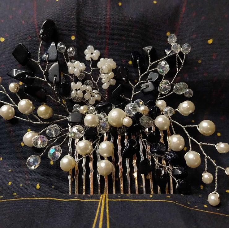 Made with ivory glass pearls, sandstone gemstones and crystals. Wired to a metal comb.
