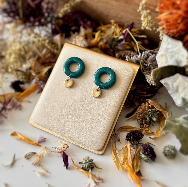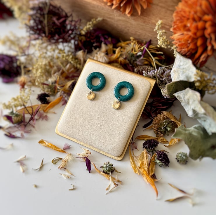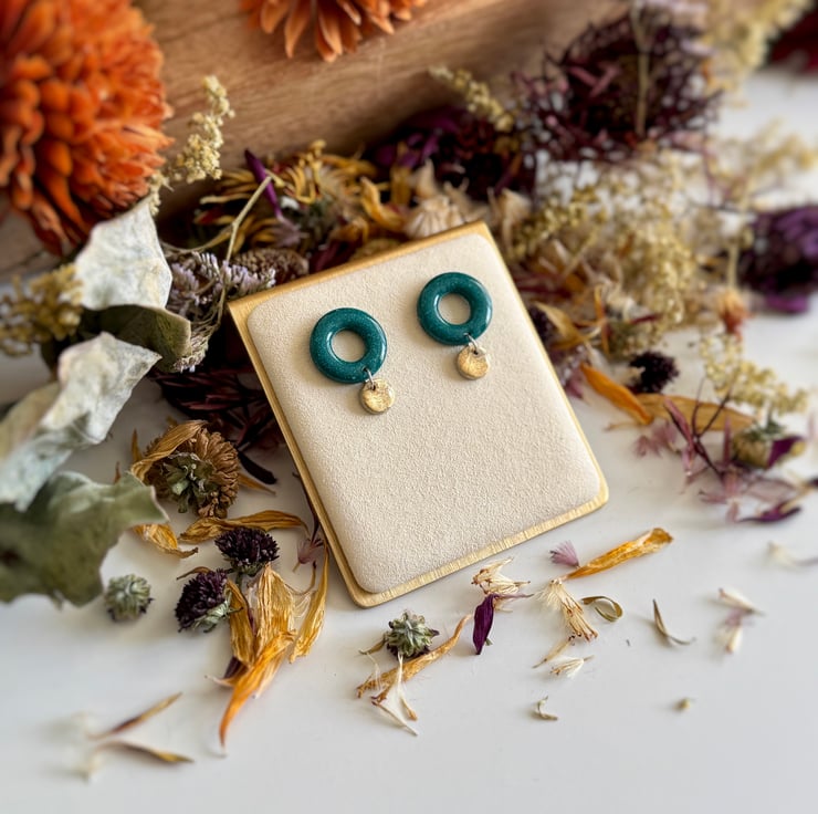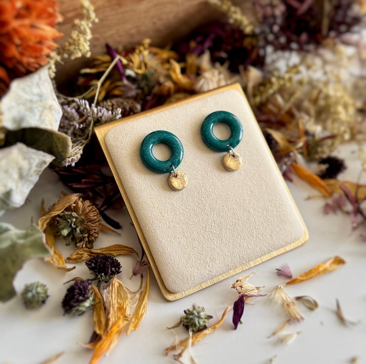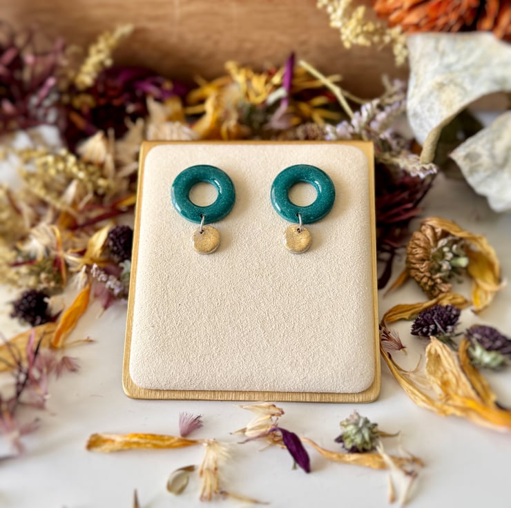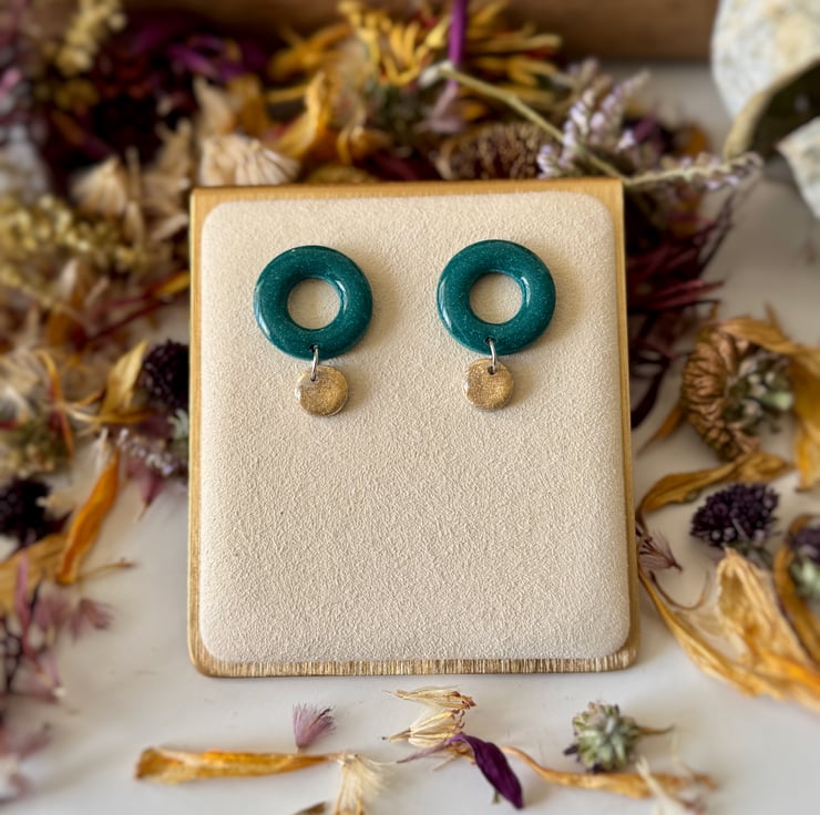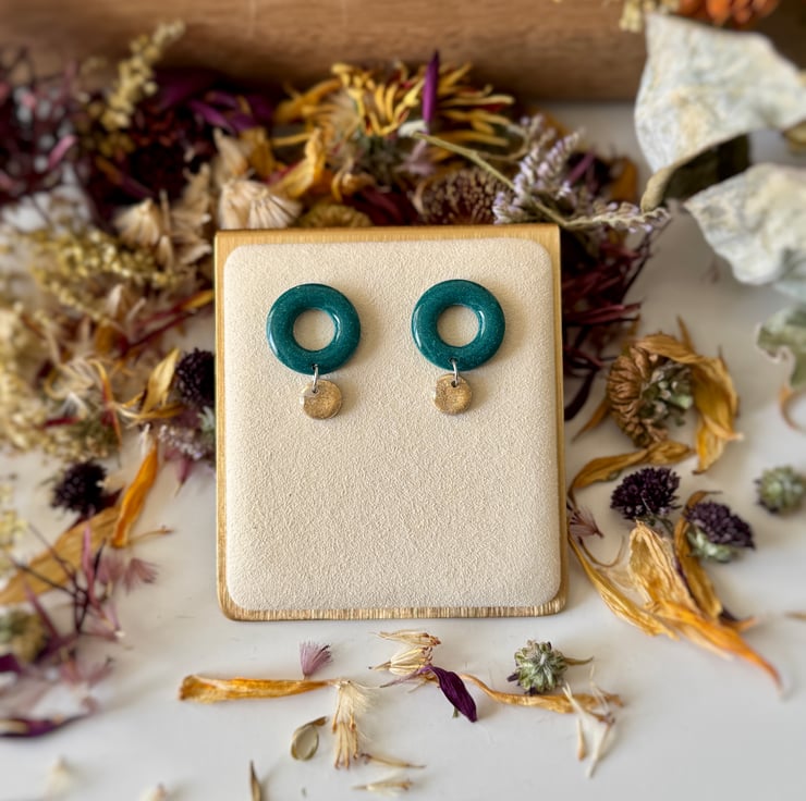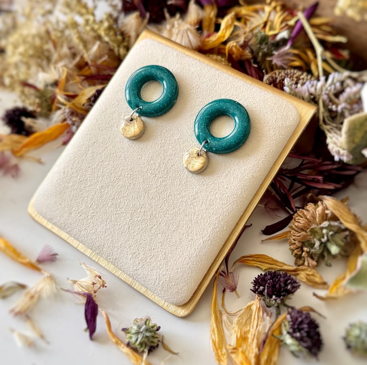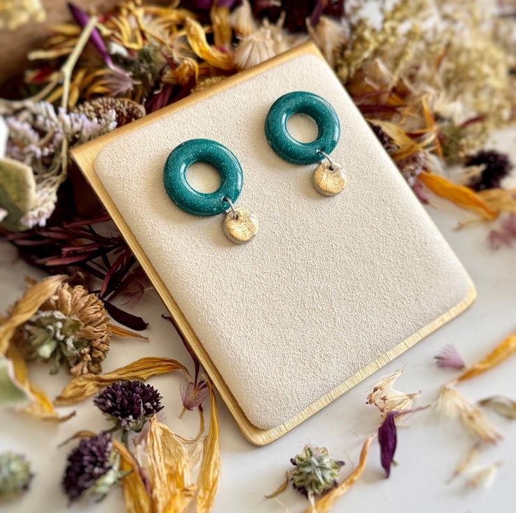 Deep Teal with an encased sparkle that is enhanced with a glossy colour enhancing uv resin finish, in a sleek hollow circle shape, with a dainty small Gold Leaf Circle to finish.