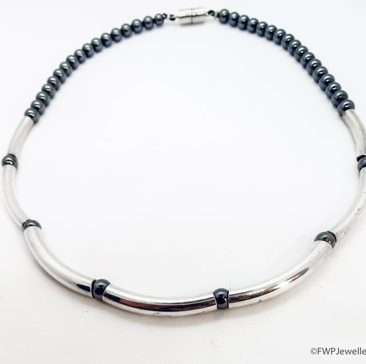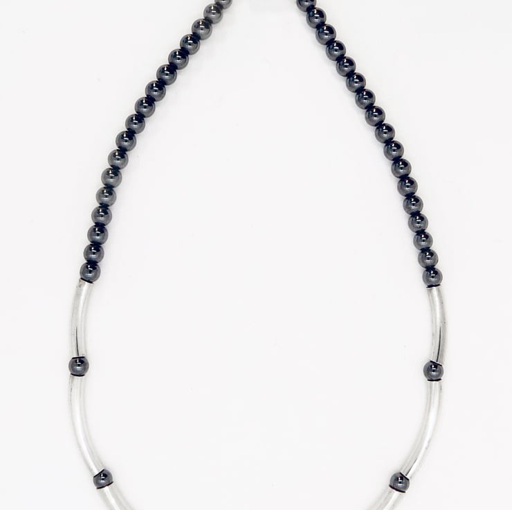 Elegant necklace featuring hematite beads interspersed with seven silver tubes and hematite bead spacers, all strung on a stretchy cord. Measures 40cm long.