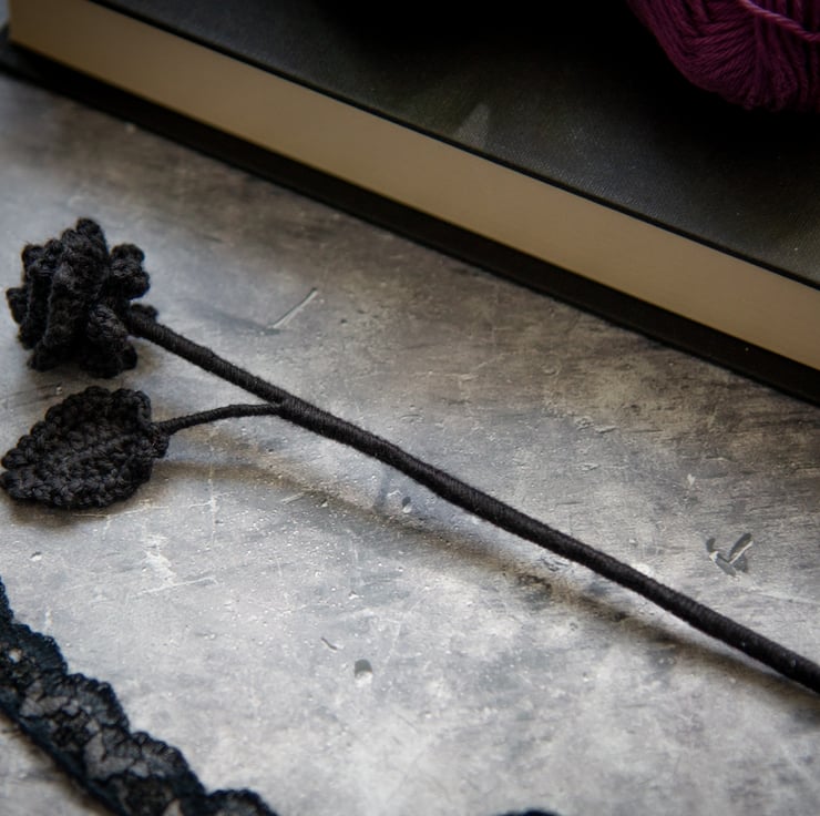 Black Rose Crochet Bookmark - crafted to slip between pages like a whispered secret. This piece evokes gothic aesthetic, soft petals in charcoal hues with a slender silhouette. Perfect for lovers of shadows, stories and slow magic, brings a touch of romantic melanchooly to any reading ritual. Can also be used as a decor item, it looks as good in a vase as it looks in a book. Whether gifted to a kindred soul or kept as a personal talisman, it’s a poetic companion for books that stir the soul. A perfect Halloween gift.