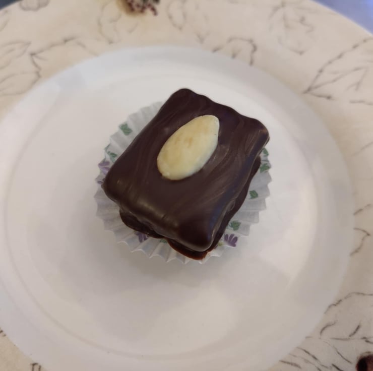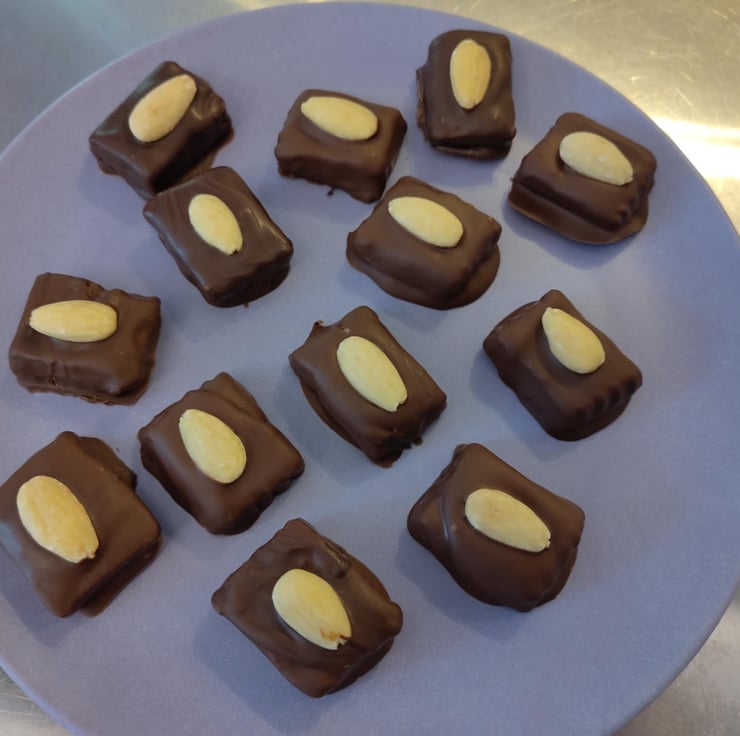 10 beautiful hand shaped and hand dipped, chocolate marzipan sweets. Delicious marzipan, luscious dark chocolate and a whole blanched almond on the top. The chocolate is Rainforest Alliance approved.