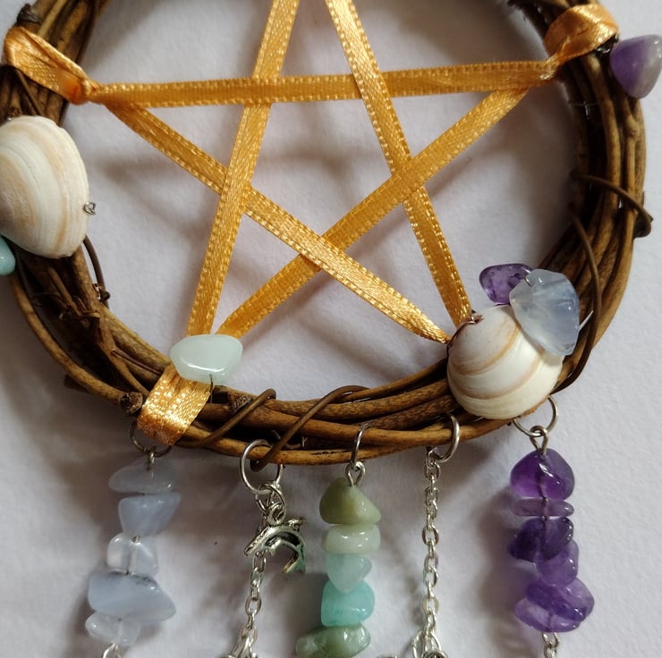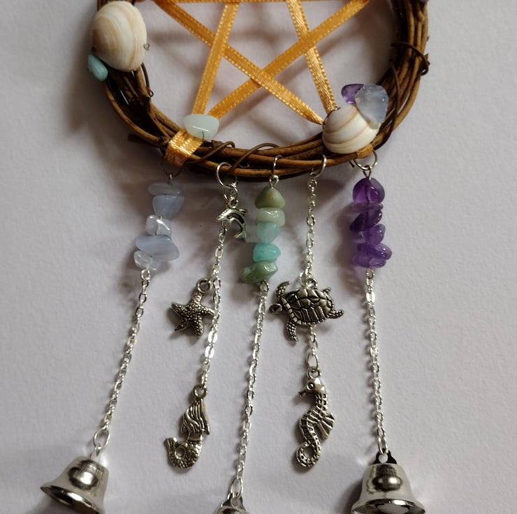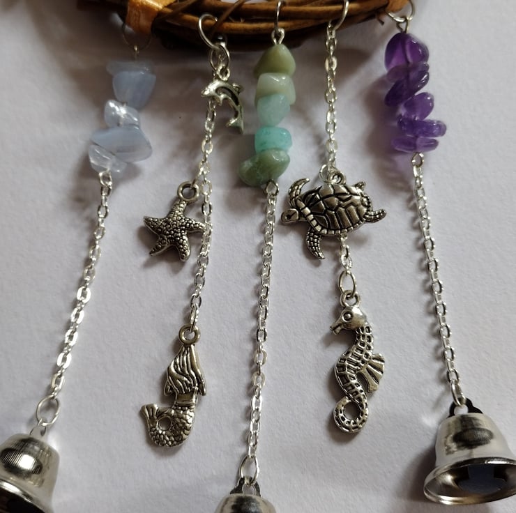 Made with sea shells, ribbon, willow, charms, silver tone bells and gemstones. Gemstones are blue lace agate, amethyst