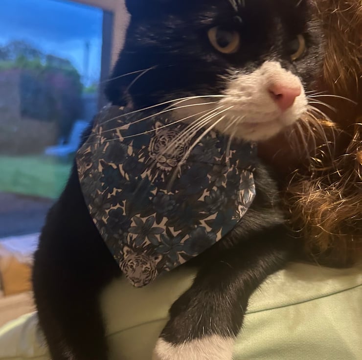 She looks cute without a wee bandana, but even more so adorned in Liberty.