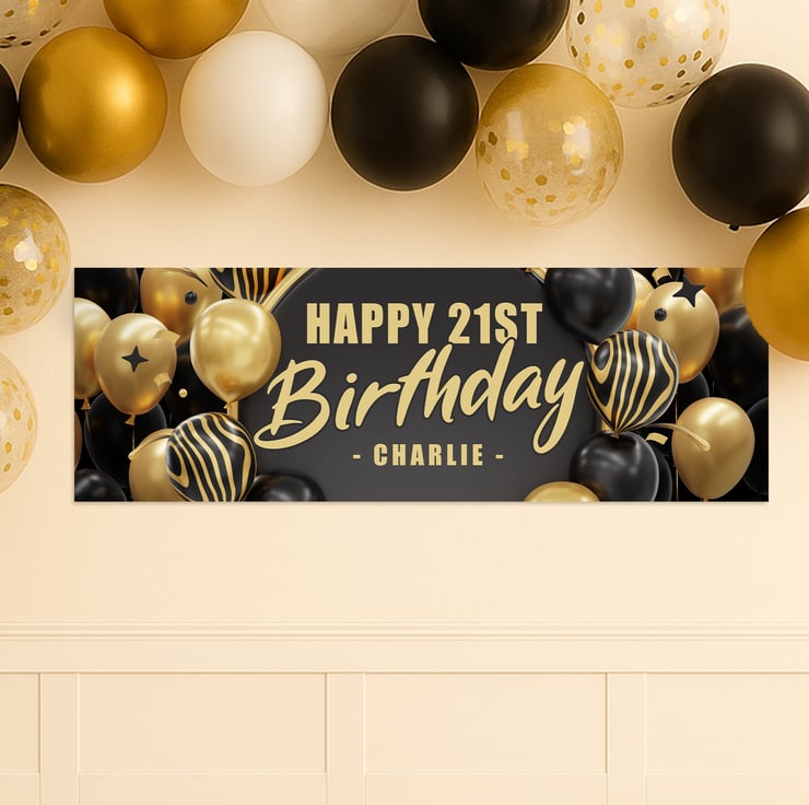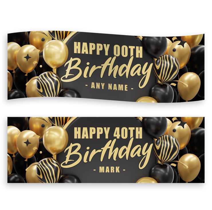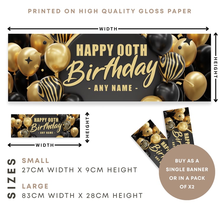 Celebrate in style with this elegant Black & Gold personalised birthday banner, perfect for milestone birthdays and special celebrations. Featuring a bold black background with striking gold balloons, this banner makes the perfect party centrepiece. Personalise with any name (up to 8 characters) and age to create a unique party decoration that guests will love. Printed on high-quality gloss paper, this banner is available in two sizes and can be purchased as a single piece or in a pack of two.