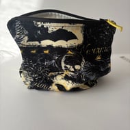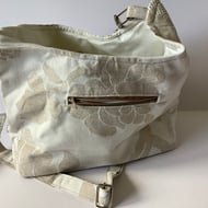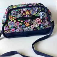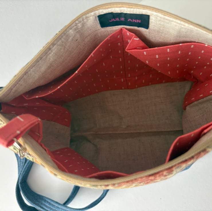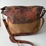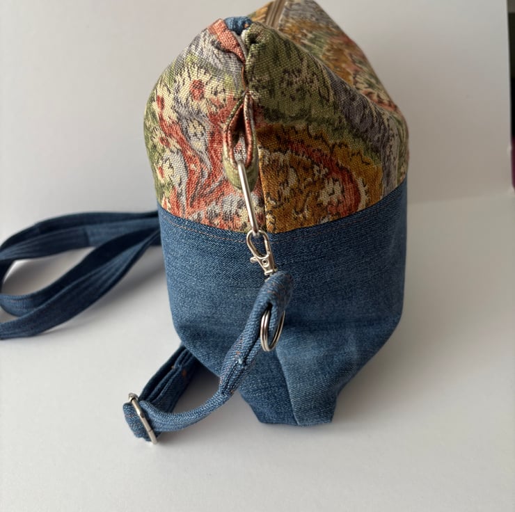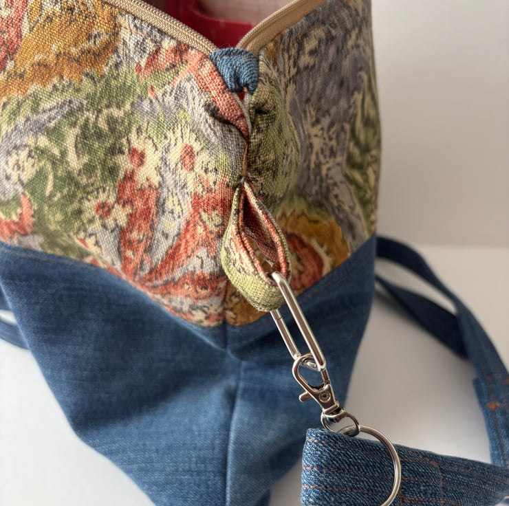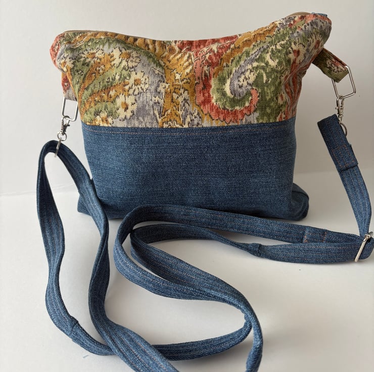 This is a roomy hand made upcycled denim and tapestry shoulder bag. It has in terror pockets and a key fob . The is a long adjustable shoulder strap and zipped top closure. Size