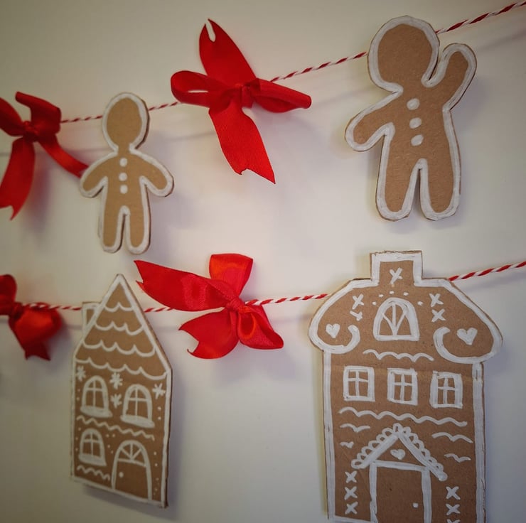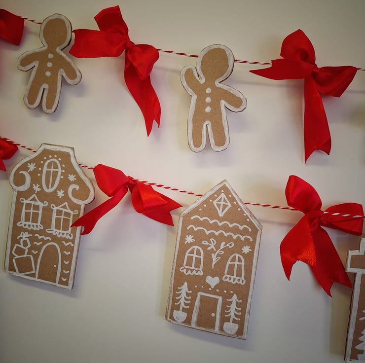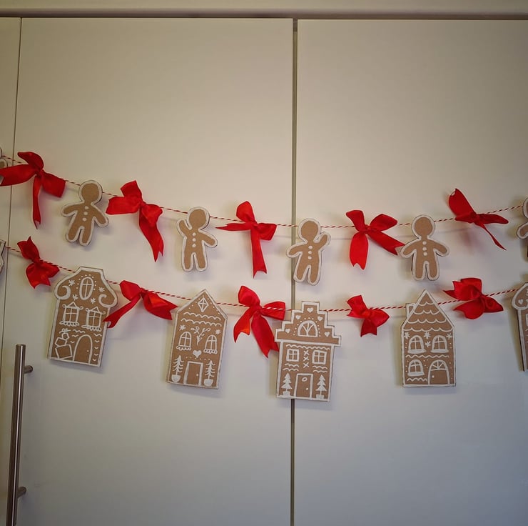 Two garlands, approximately 110-115cm long, 7 gingerbread men each 9cm on one garland, 6 gingerbread houses 13cm each on the other.