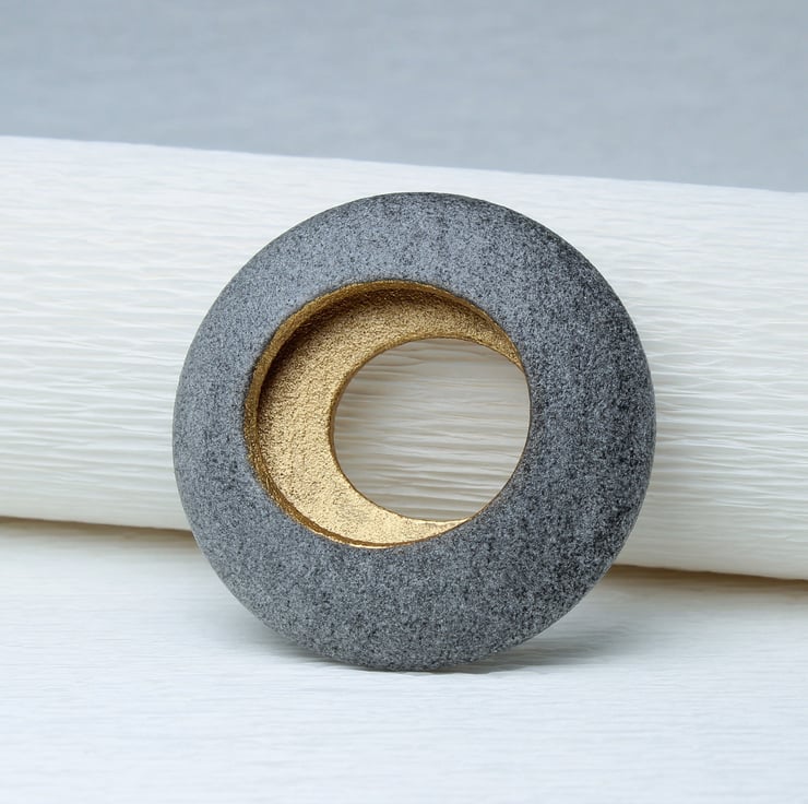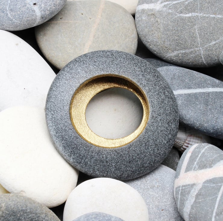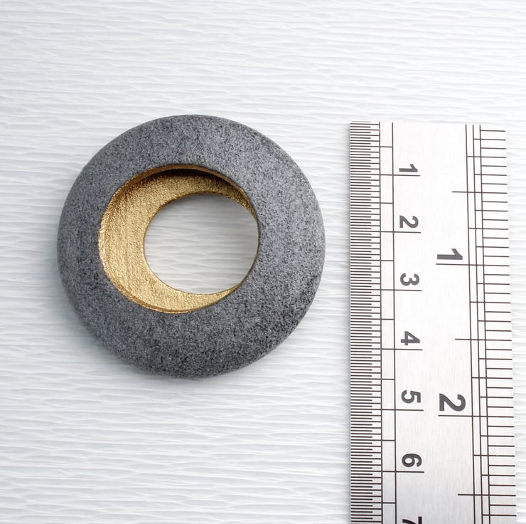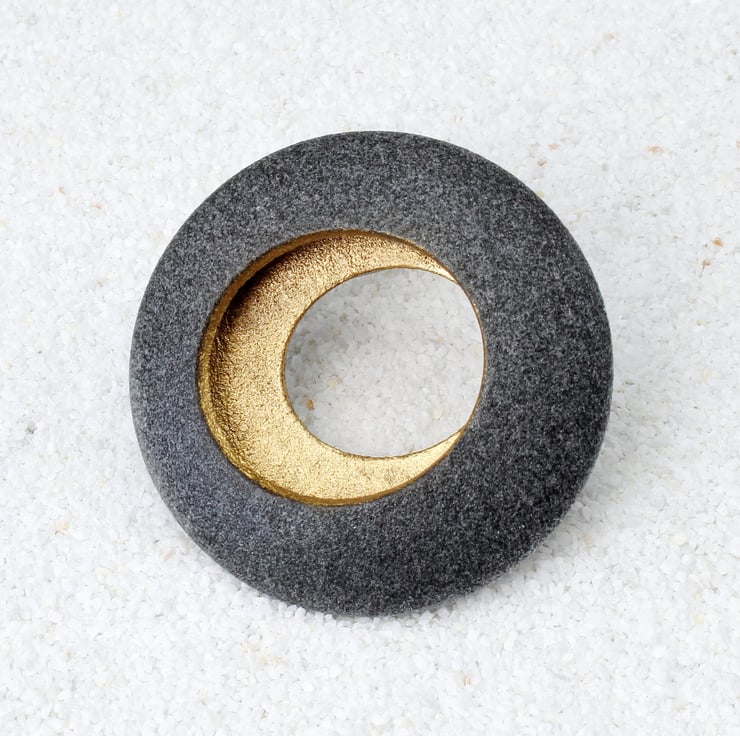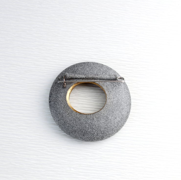 This round brooch is inspired by the smooth pebbles found during our beach combing excursions. While its shape could make it an excellent skimming stone, we advise against using it for that purpose :-). Crafted from a blend of glass powder and synthetic polymer, the brooch is both lightweight and durable, ensuring comfort for the wearer. Its hollow interior radiates a golden glow and it measures 42mm x 42mm by 10mm, it is coated on both the inside and outside to guard against fingerprints and tarnishing. Each piece is elegantly packaged in our branded gift boxes.