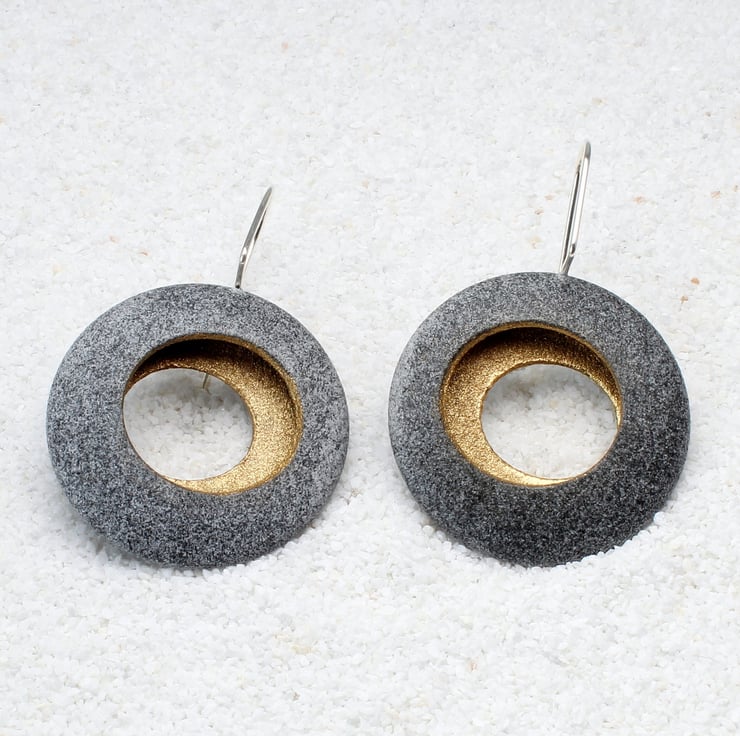 These wonderful round pebble earrings, designed by John, are inspired by the beauty of nature and made from a combination of glass powder and synthetic polymer. This blend ensures that the earrings are not only strong, lightweight and durable but also comfortable for daily wear. Measuring 32mm by 32mm, they feature sterling silver ear wires and have a total drop length of 45mm. A protective coating is applied to the surface, preventing fingerprints and lotions from tarnishing their elegant look.