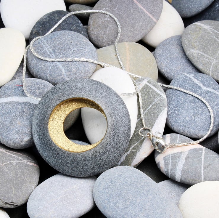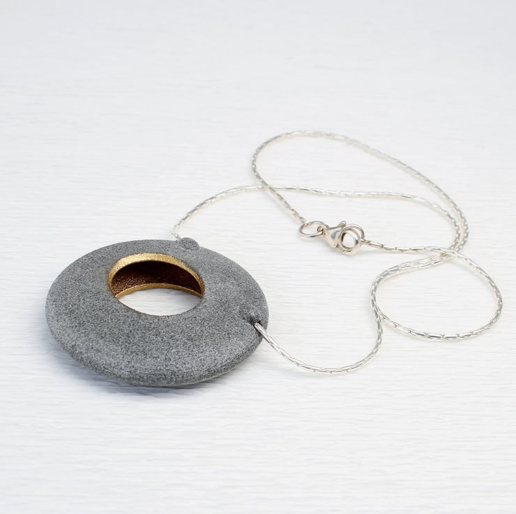 This beautiful round pebble pendant, designed by John, is made from a blend of glass powder and synthetic polymer, providing exceptional strength and durability. Its hollow structure ensures a remarkably lightweight feel, perfect for daily wear. the hollow centre has been coated with liquid gold for a luxurious, contrasting look. With dimensions of 44mm x 44mm by 10mm, the pendant is elegantly hung from a 45cm sterling silver chain.