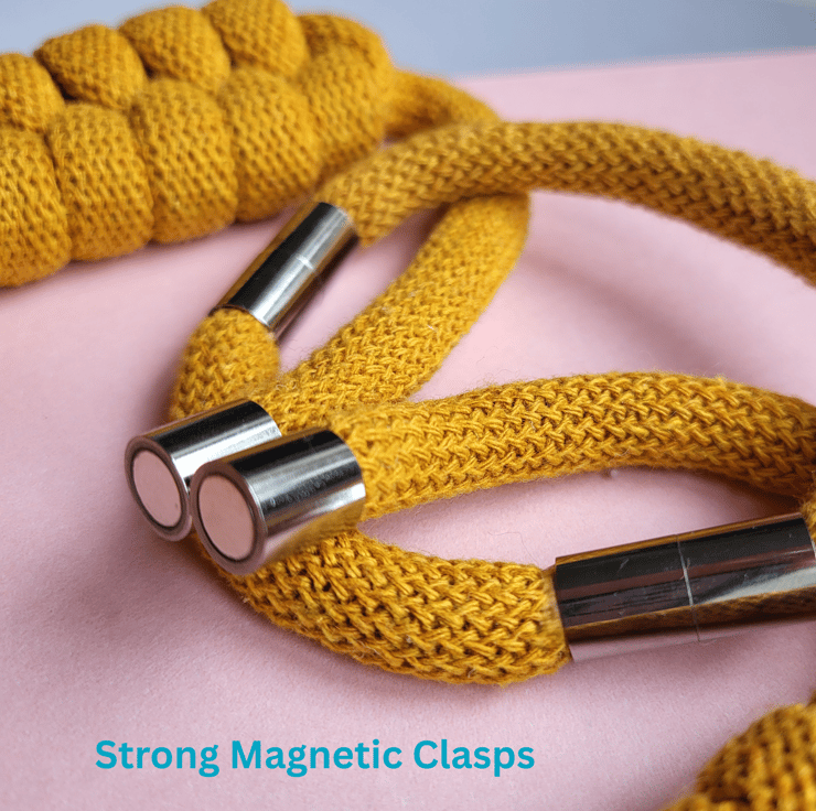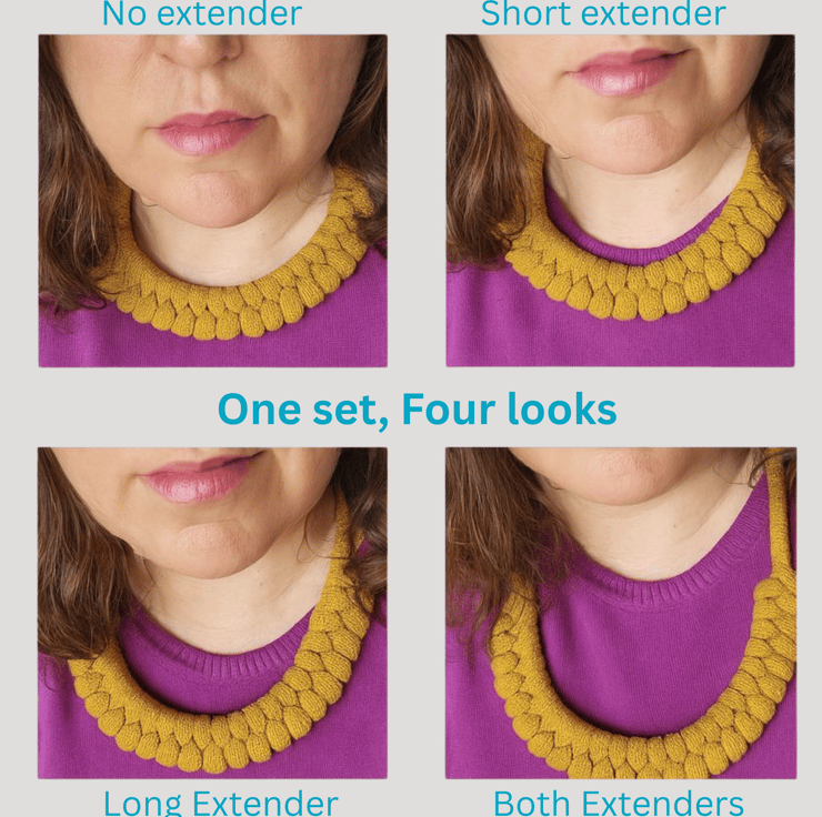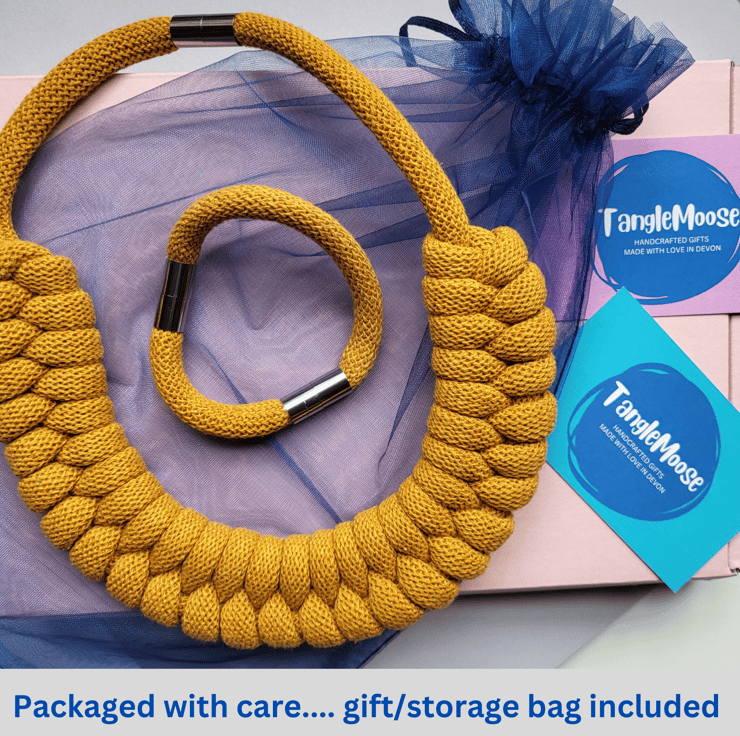 I love working with cotton and this colour brings some sunshine into any outfit - looks great over a jumper or dress, you can dress it up or dress it down! Very comfortable to wear and comes with a bracelet which magically turns into two different sized extenders so you have four lengths to wear your necklace.