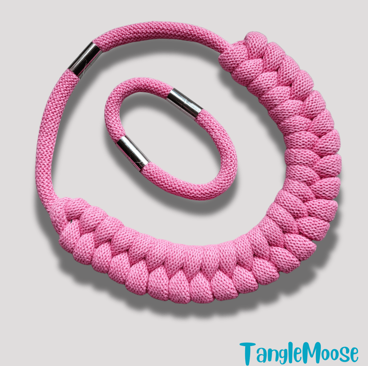 Bring a pop of colour to your outfit with this bright pink necklace and bracelet set, handmade from recycled cotton. Designed to be both stylish and sustainable, this chunky textile jewellery is lightweight, comfortable, and full of character.