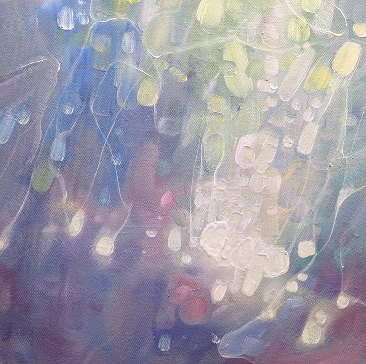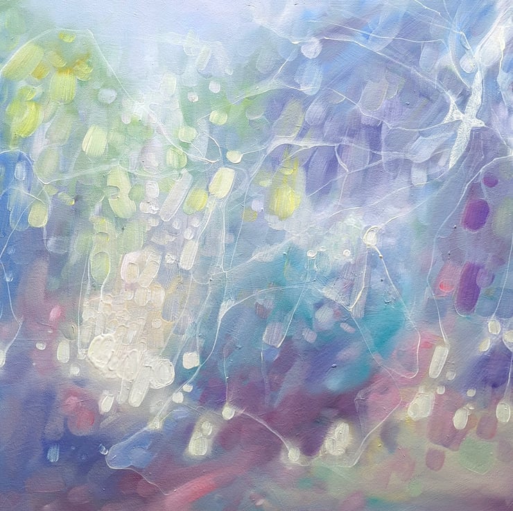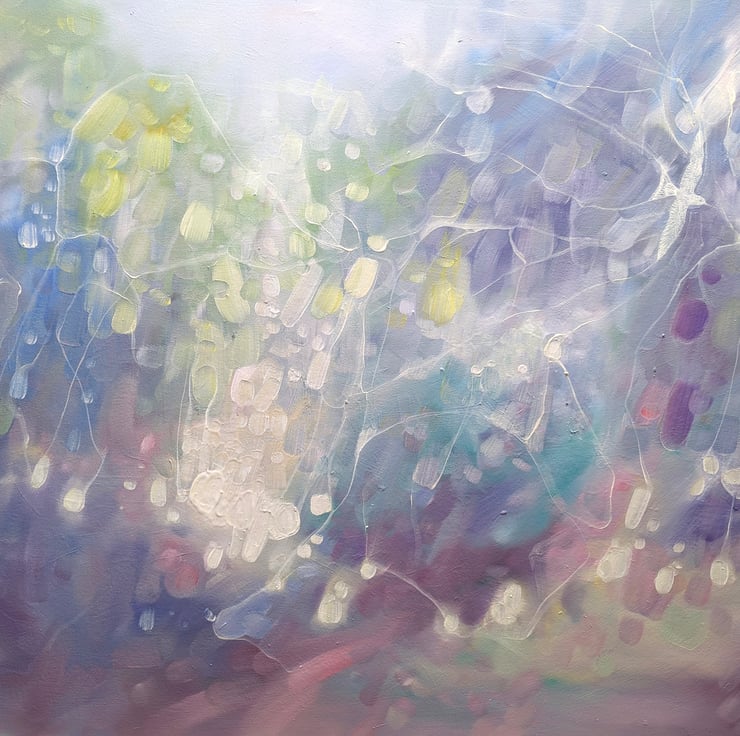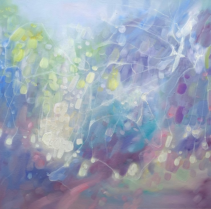 Summer Spirit is an hazy abstract landscape oil painting that hints of a shadowy late summer meadow and trees. It is 36x24x1.5 inches. A transparent swallow can be seen to the right and behind her you can see the suggestion of out of focus flowers, trees and a meadow. It captures a moment from a summer walk in Mayfield – made from memory which retains the feel of it more that the accuracy of the meadow I was in. The colours range through violet, green, yellow, pink and blue. The aim of this painting was to express the sensation of looking at a landscape with eyes partly shut. The swallow is the spirit of summer as they come to the UK during summertime and represent summer to me. Painted on deep edge canvas, edges white, ready to hang and comes with certificate of authenticity.