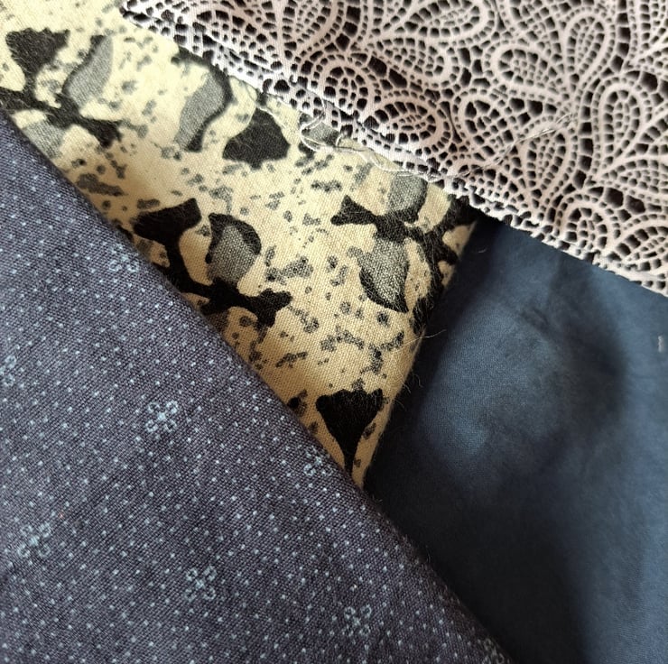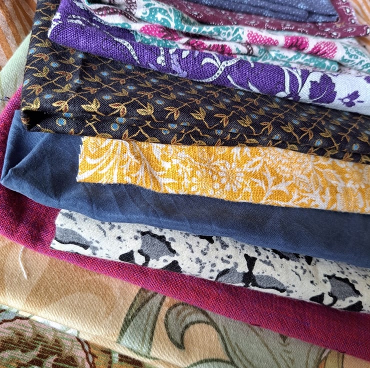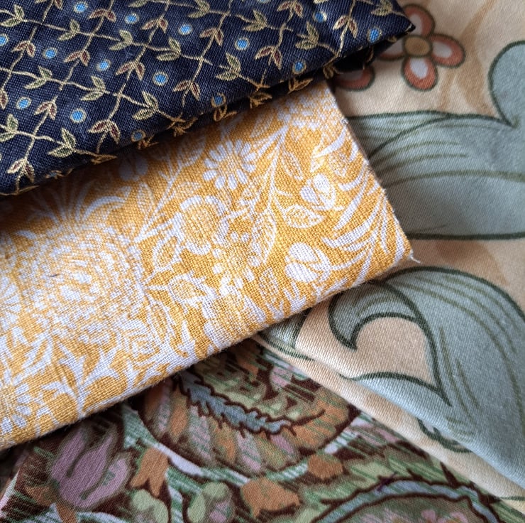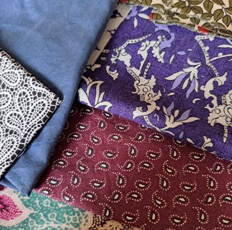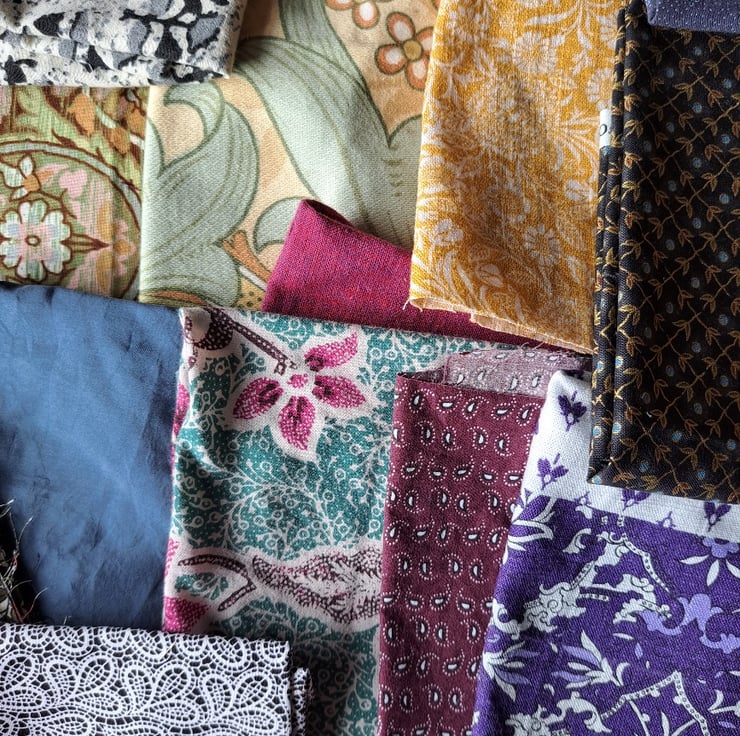 Olde English charm in this bundle of 12 cotton and linen (and one vintage washed silk) pieces with a nod to Tudor style. The fabrics are a mixture of vintage, new, remnant and rescued fabrics and come in a variety of weights, all tied together with a ruffled collar. Add them to your next doublet.